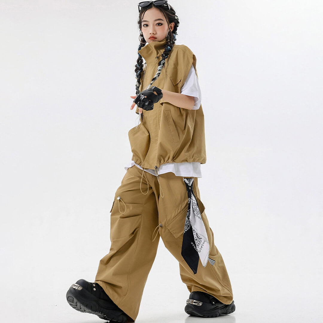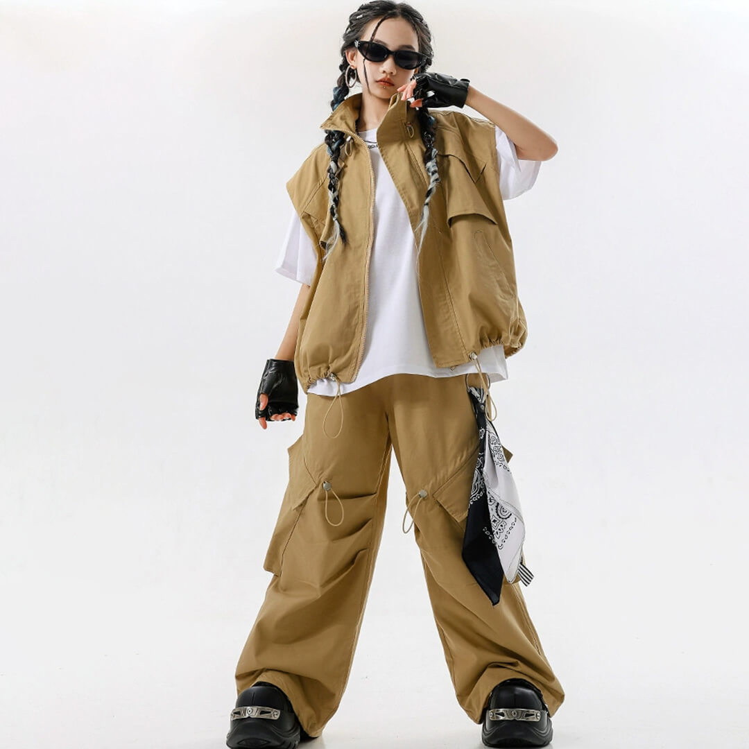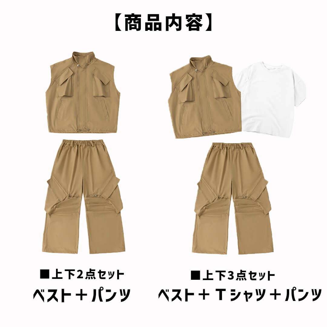 ユニセックス ベスト Tシャツ ベージュ ブラウン ストリート 無地 ロングパンツ カーゴパンツ ノースリーブ【dc-2148】