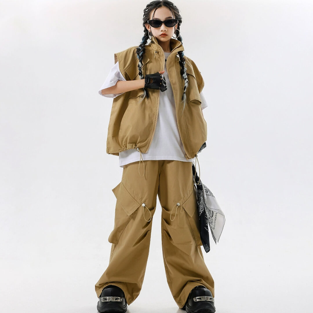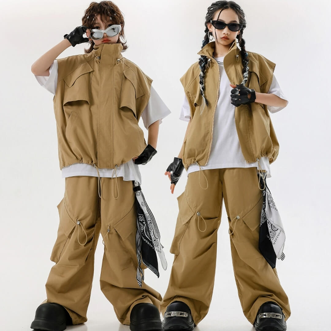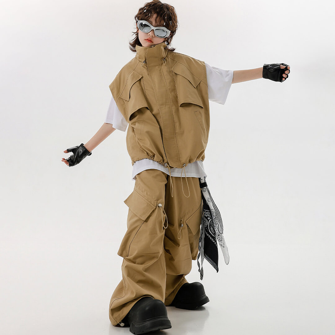 ユニセックス ベスト Tシャツ ベージュ ブラウン ストリート 無地 ロングパンツ カーゴパンツ ノースリーブ【dc-2148】