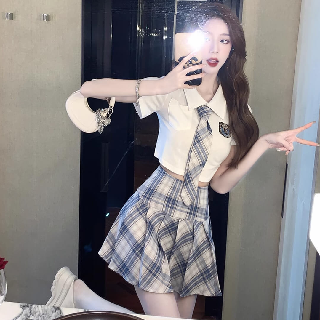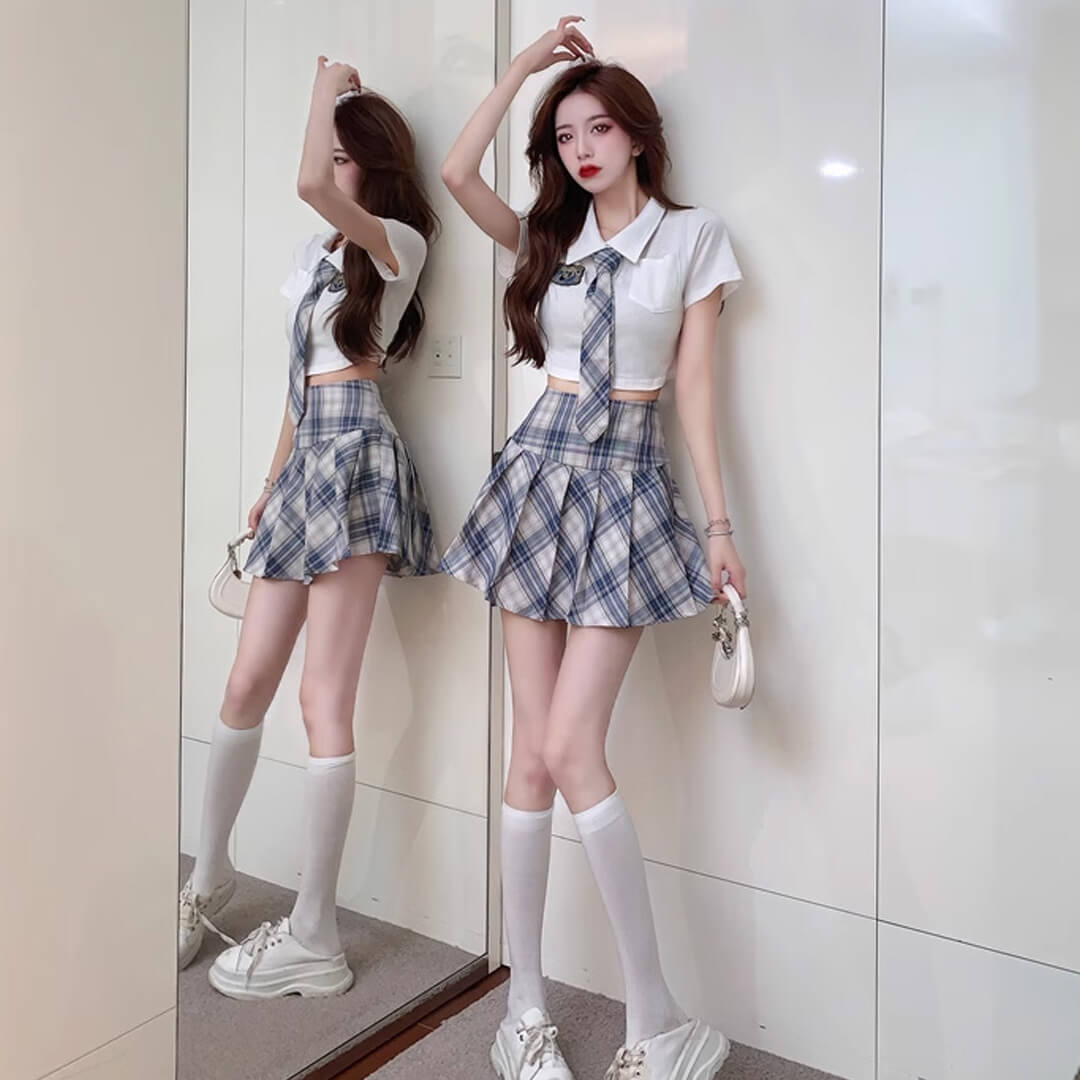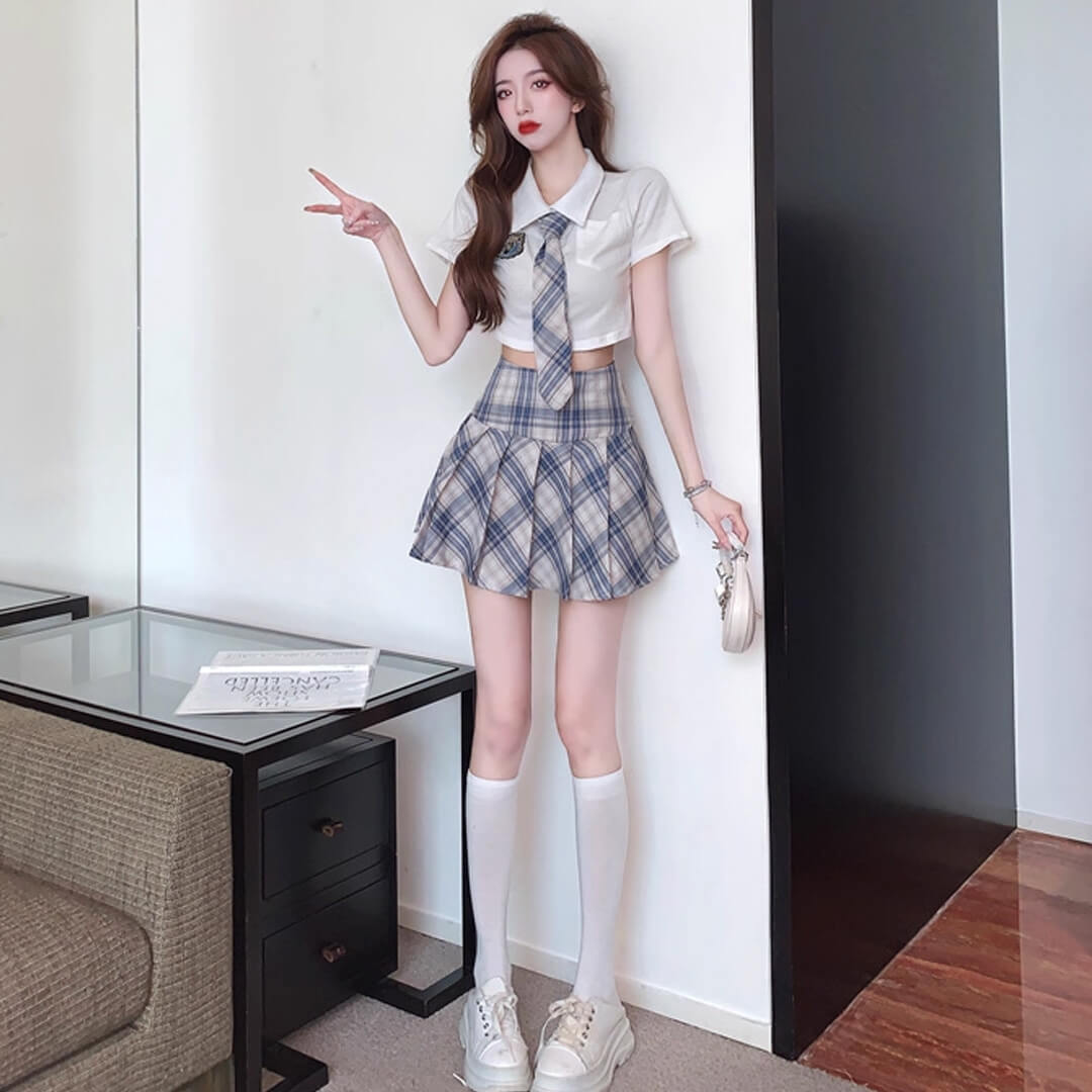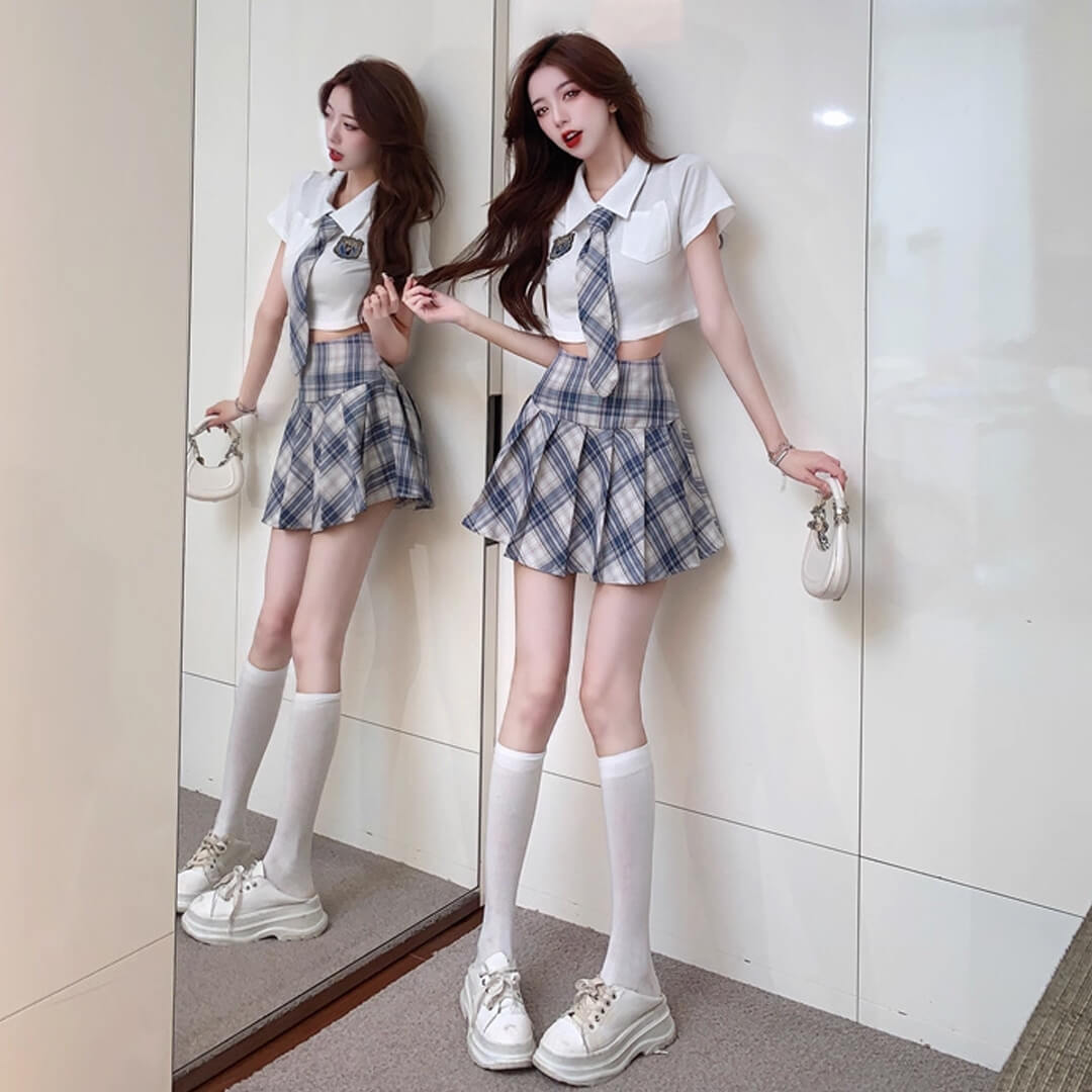 kpop ブルー ミニスカート プリーツスカート シャツ ネクタイ付き 半袖 チェック 韓国 制服【ad-342】
