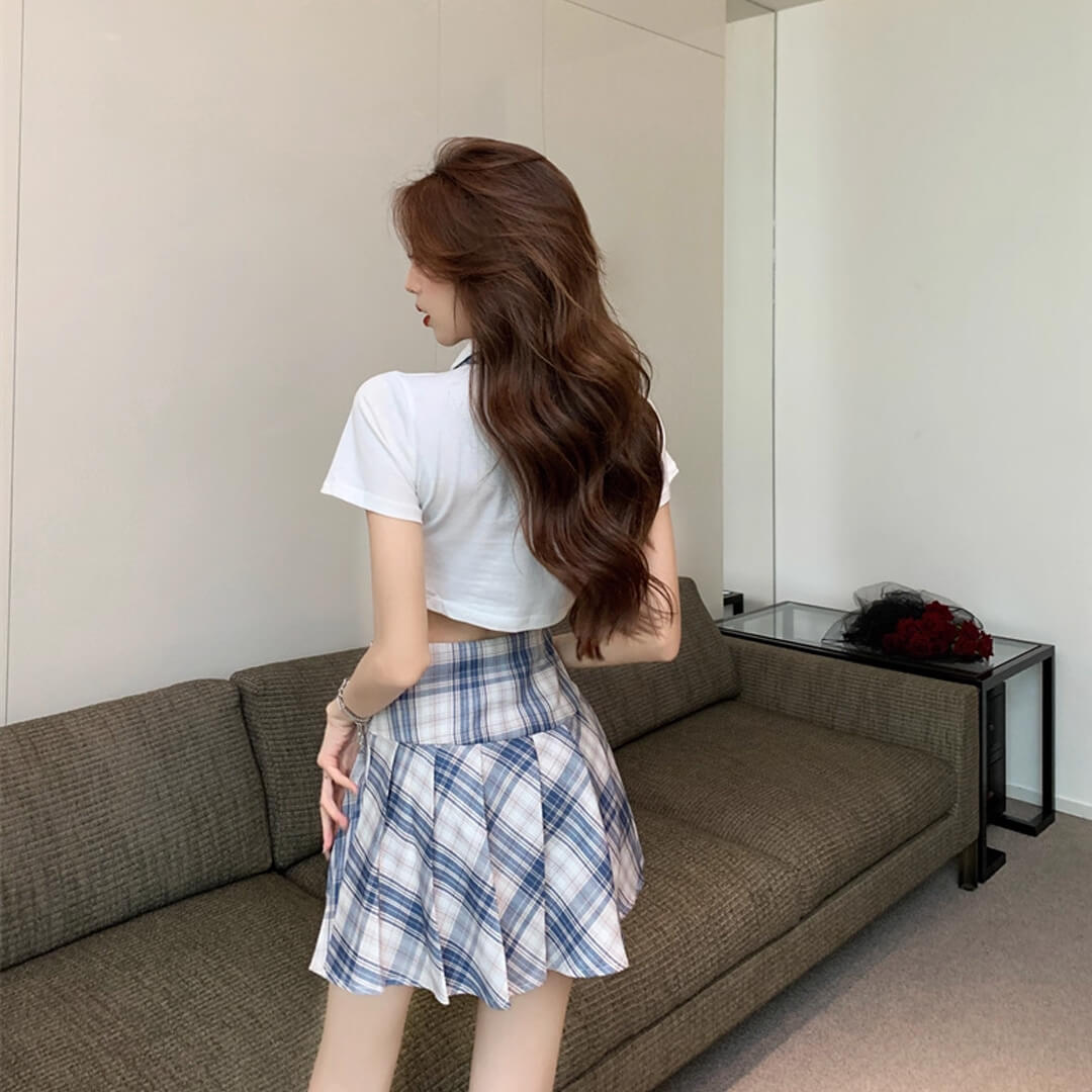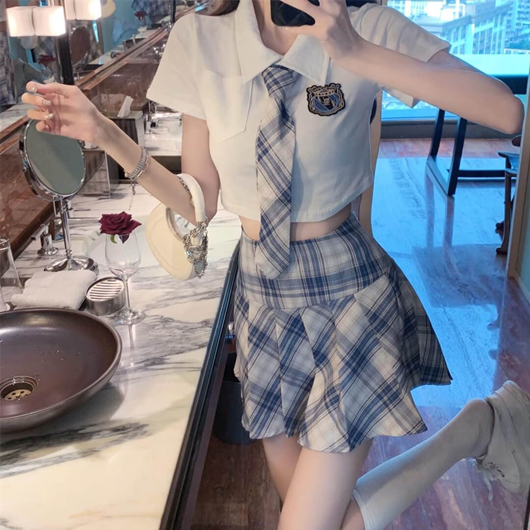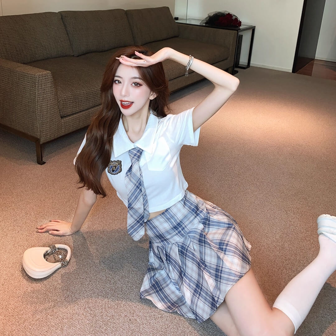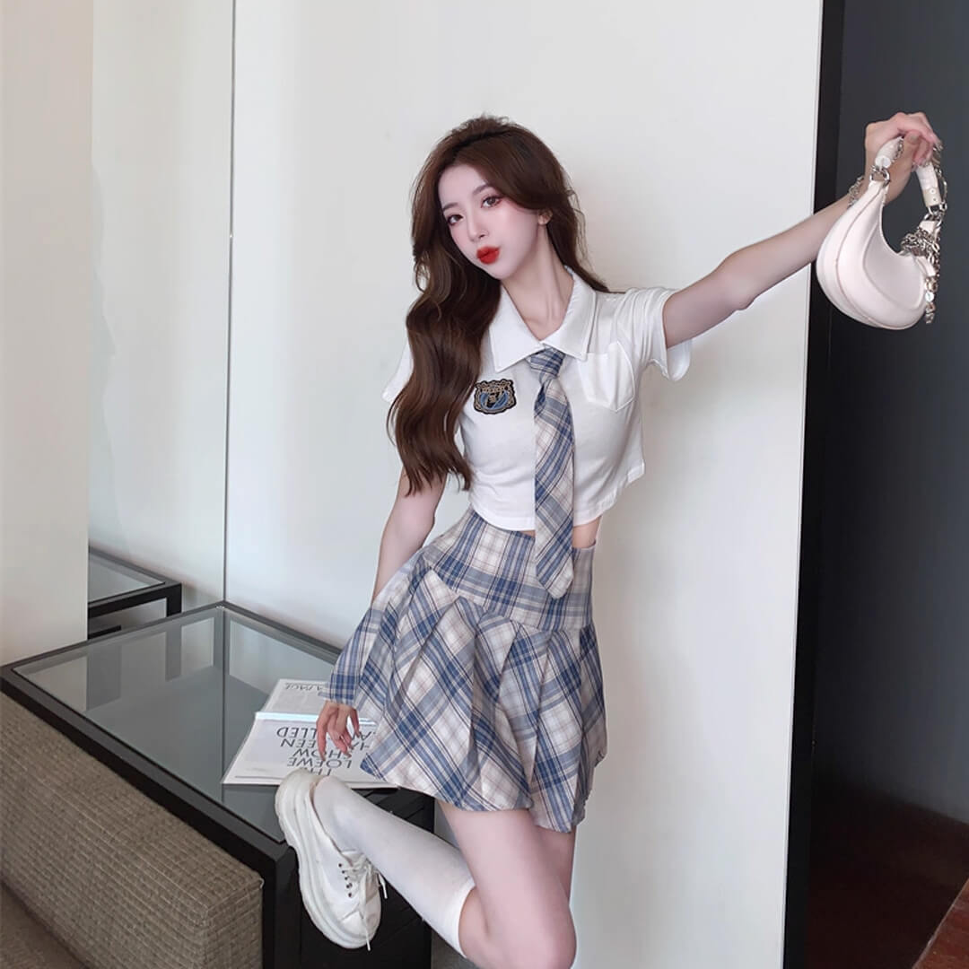 kpop ブルー ミニスカート プリーツスカート シャツ ネクタイ付き 半袖 チェック 韓国 制服【ad-342】