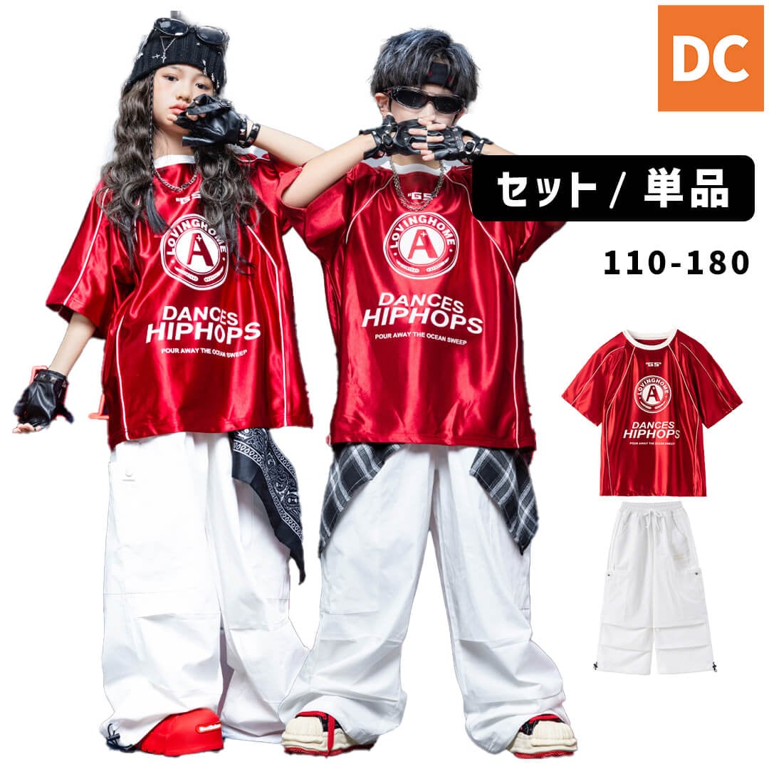 ユニセックス Tシャツ レッド ホワイト 半袖 ストリート ロングパンツ ルーズ オーバーサイズ レイヤード【dc-2171】