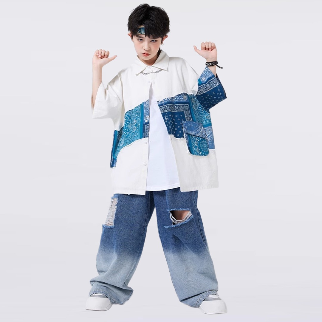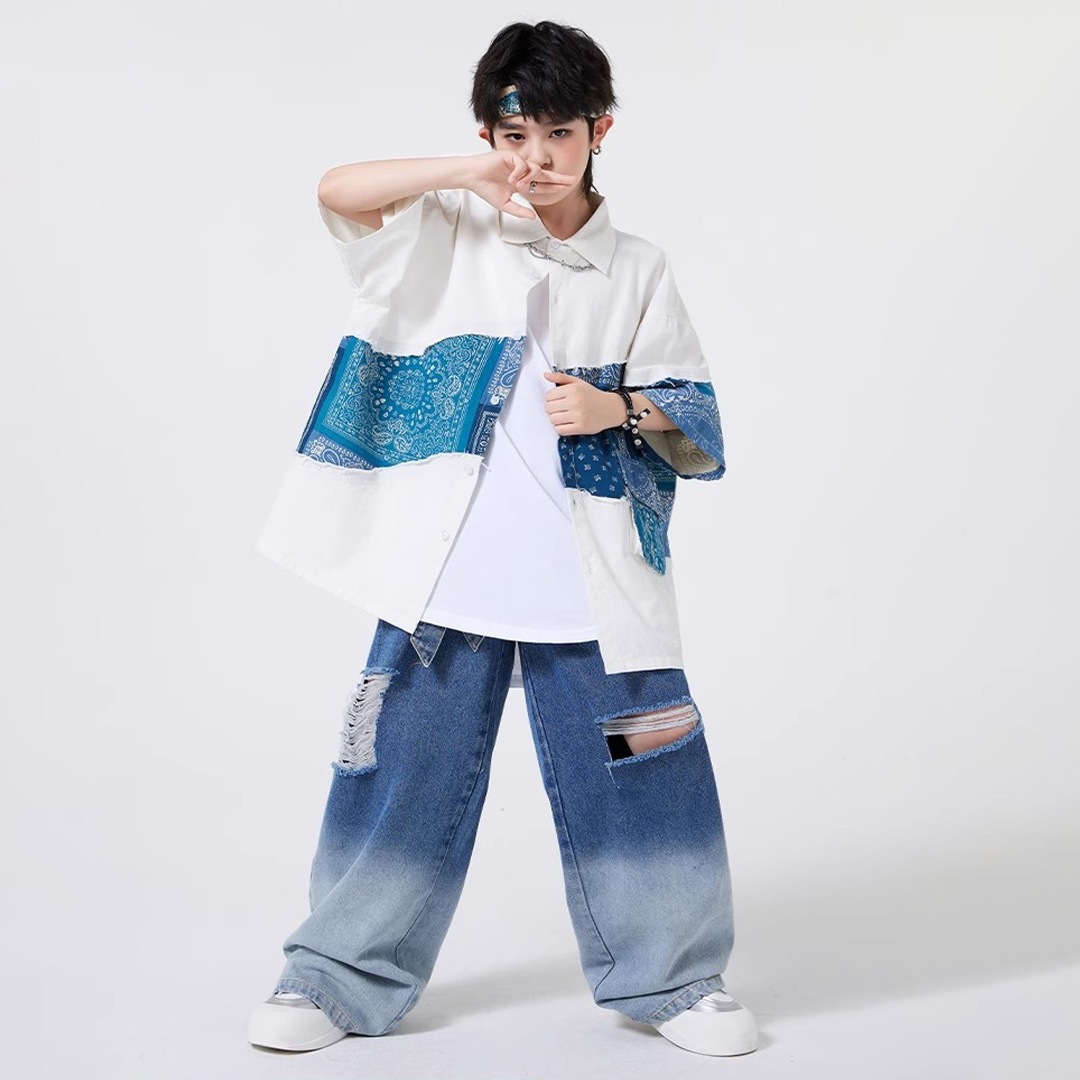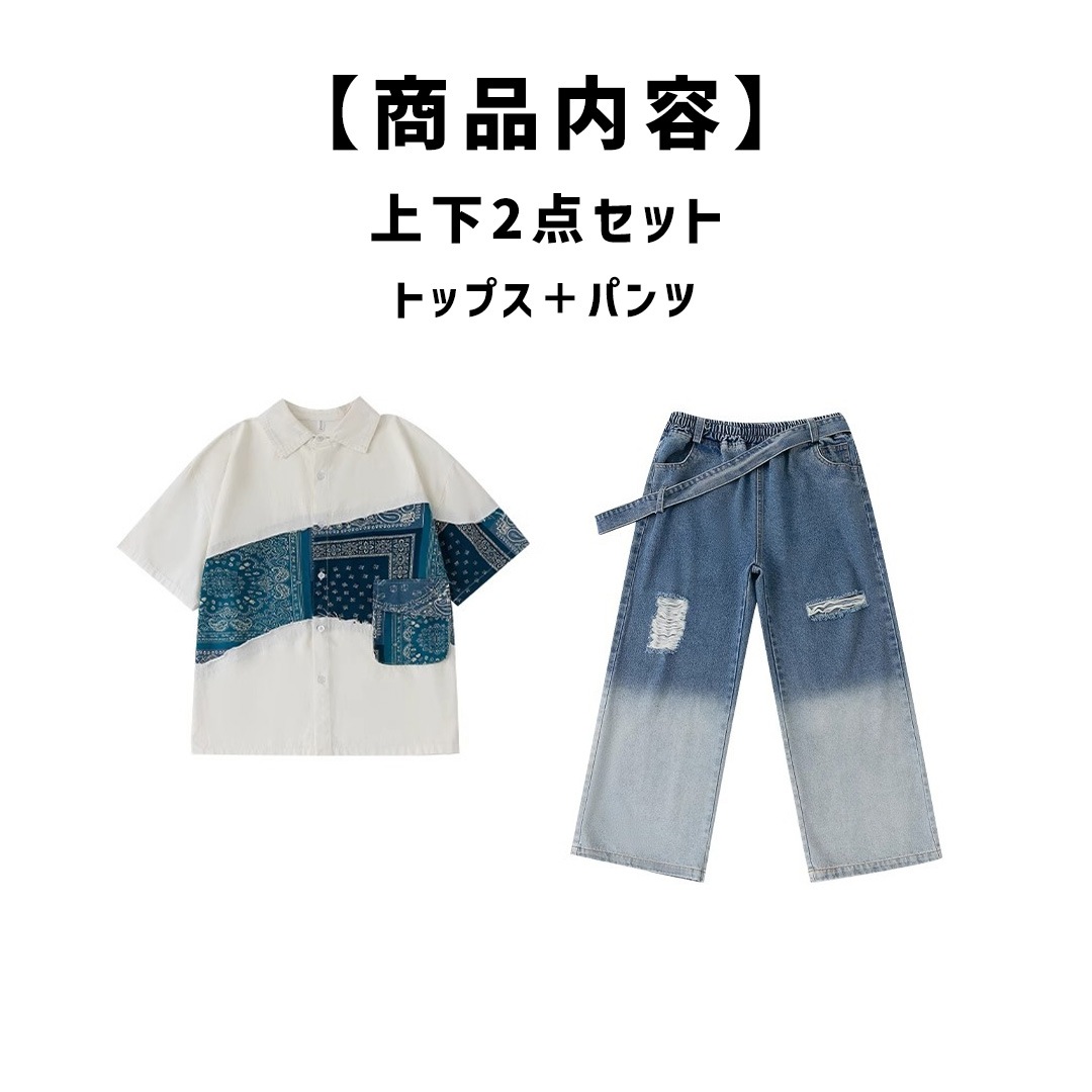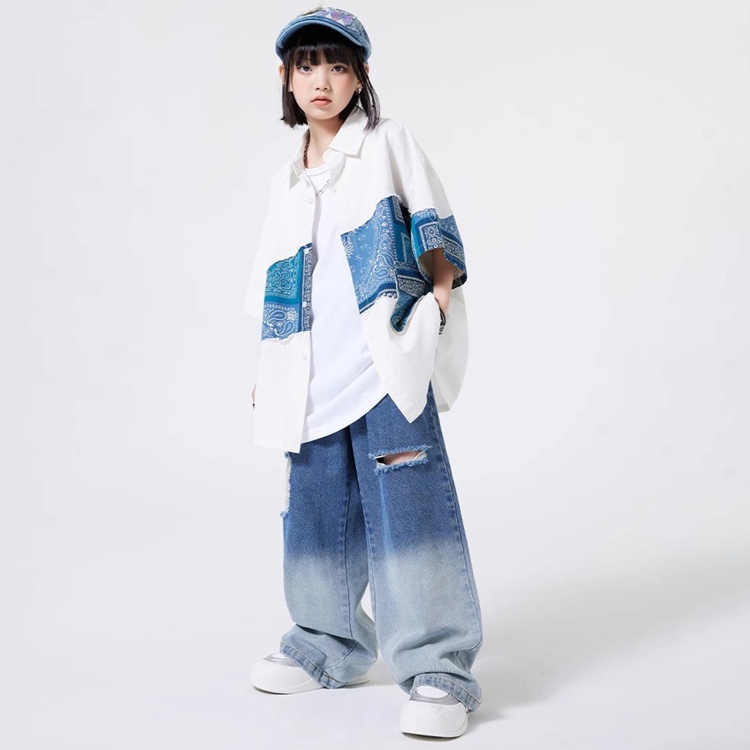 ユニセックス シャツ 前開きシャツ ホワイト ブルー ペイズリー デニム 半袖 ストリート ジーンズ ロングパンツ グラデーション【dc-2178】