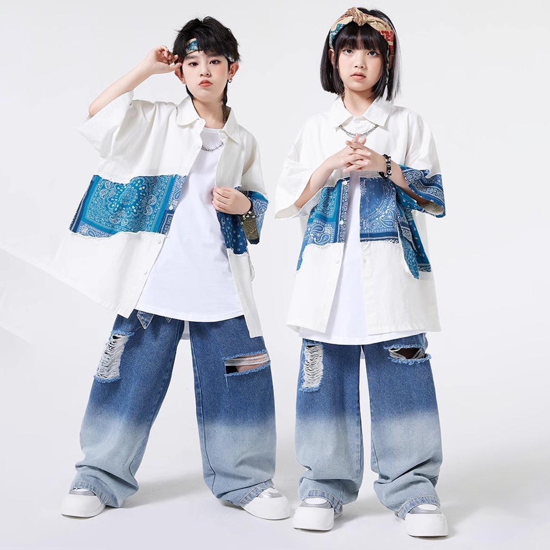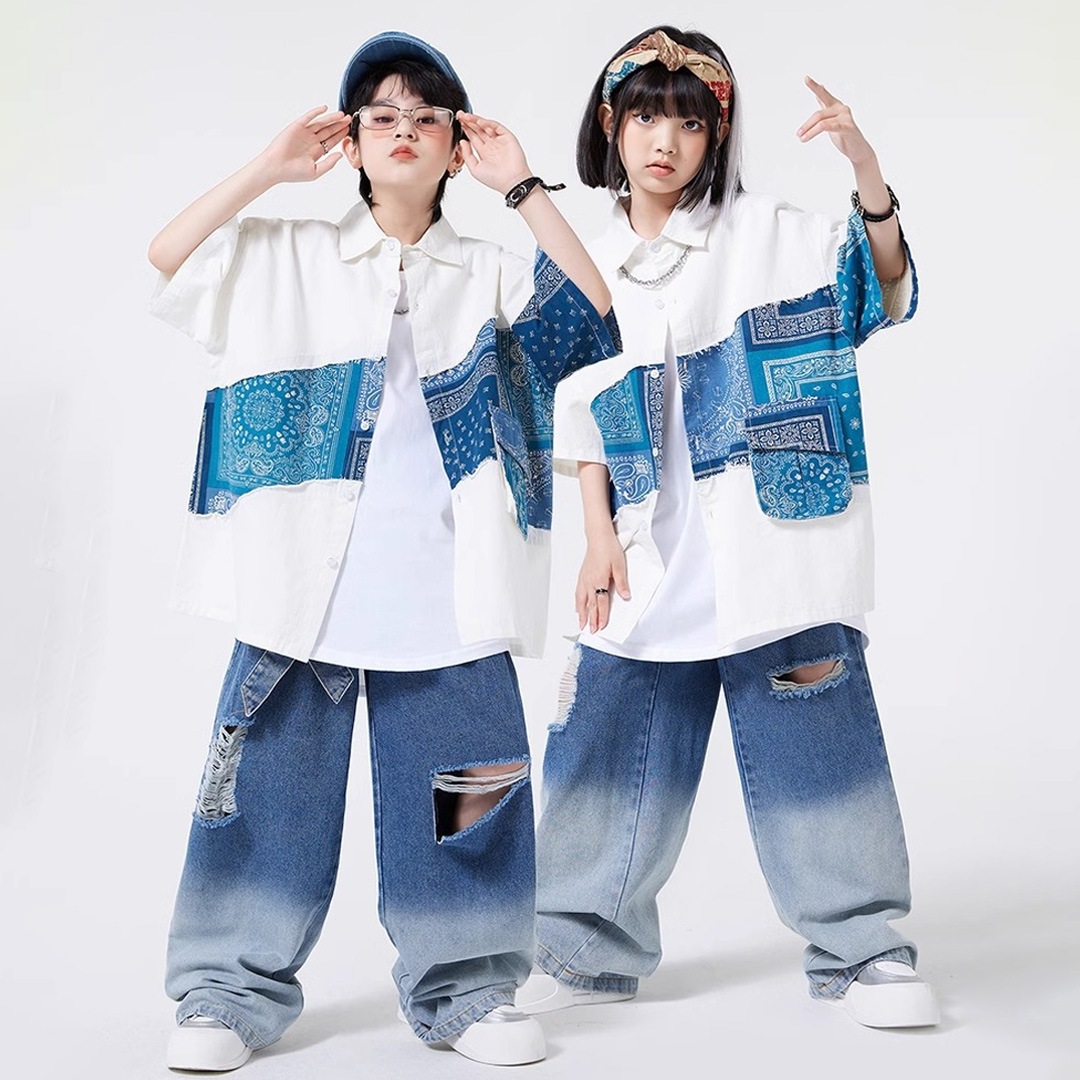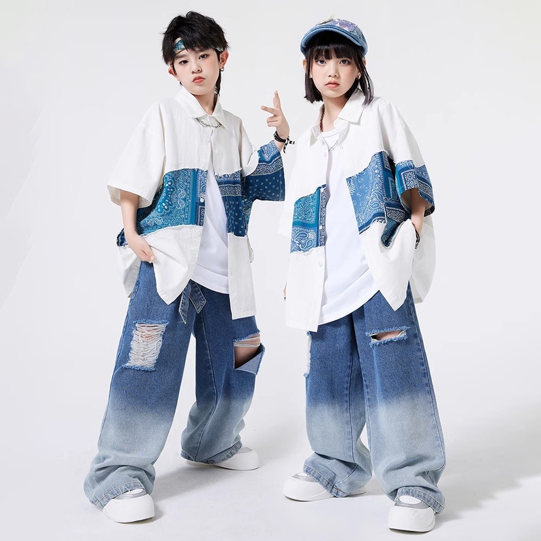ユニセックス シャツ 前開きシャツ ホワイト ブルー ペイズリー デニム 半袖 ストリート ジーンズ ロングパンツ グラデーション【dc-2178】