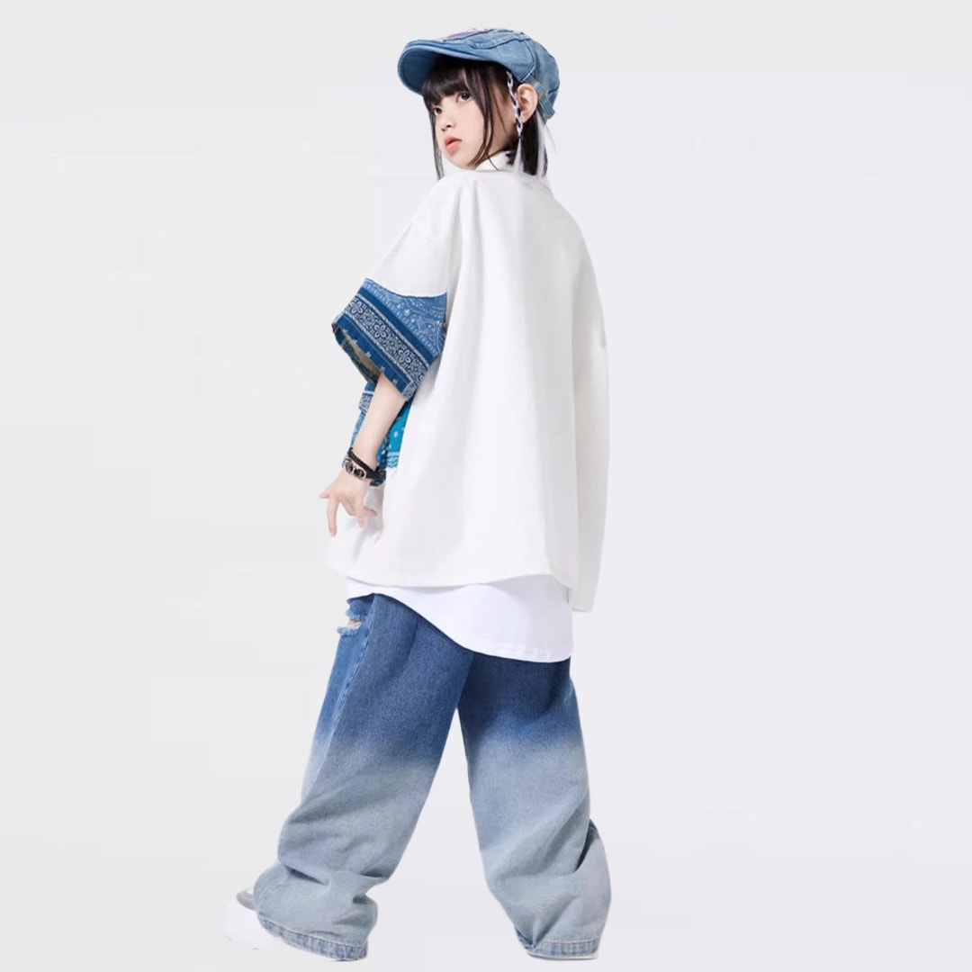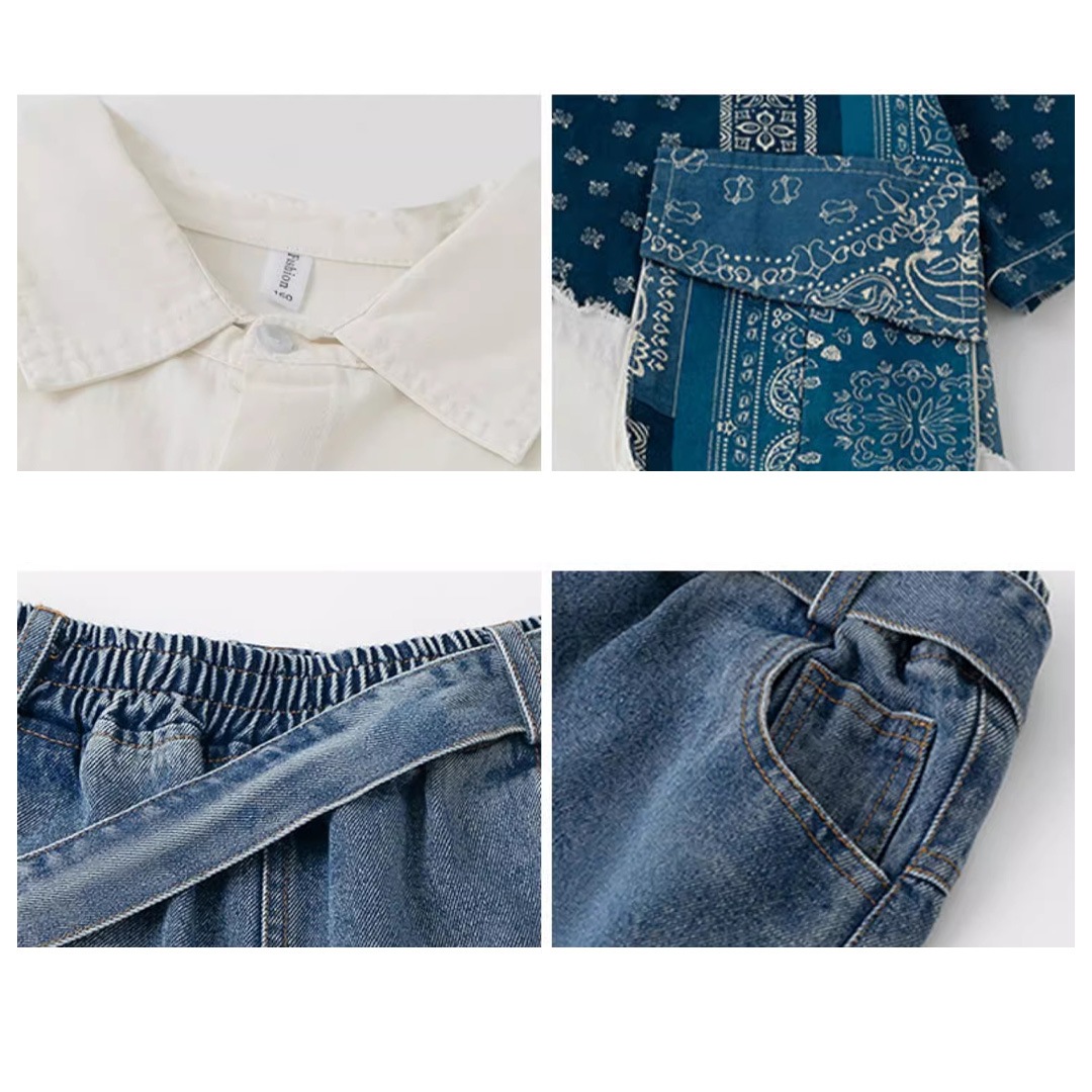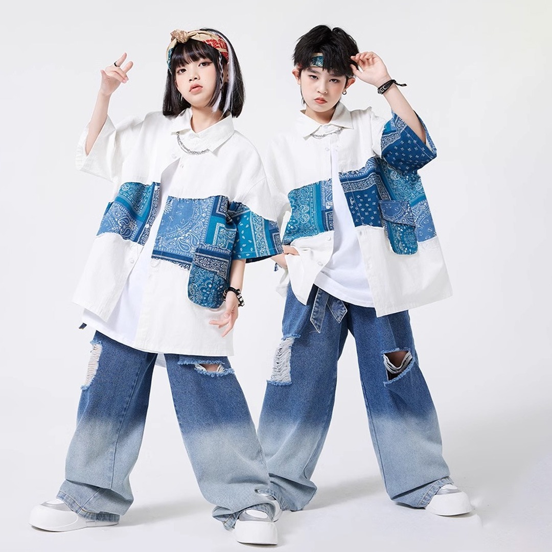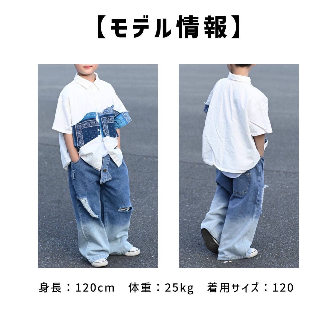 ユニセックス シャツ 前開きシャツ ホワイト ブルー ペイズリー デニム 半袖 ストリート ジーンズ ロングパンツ グラデーション【dc-2178】