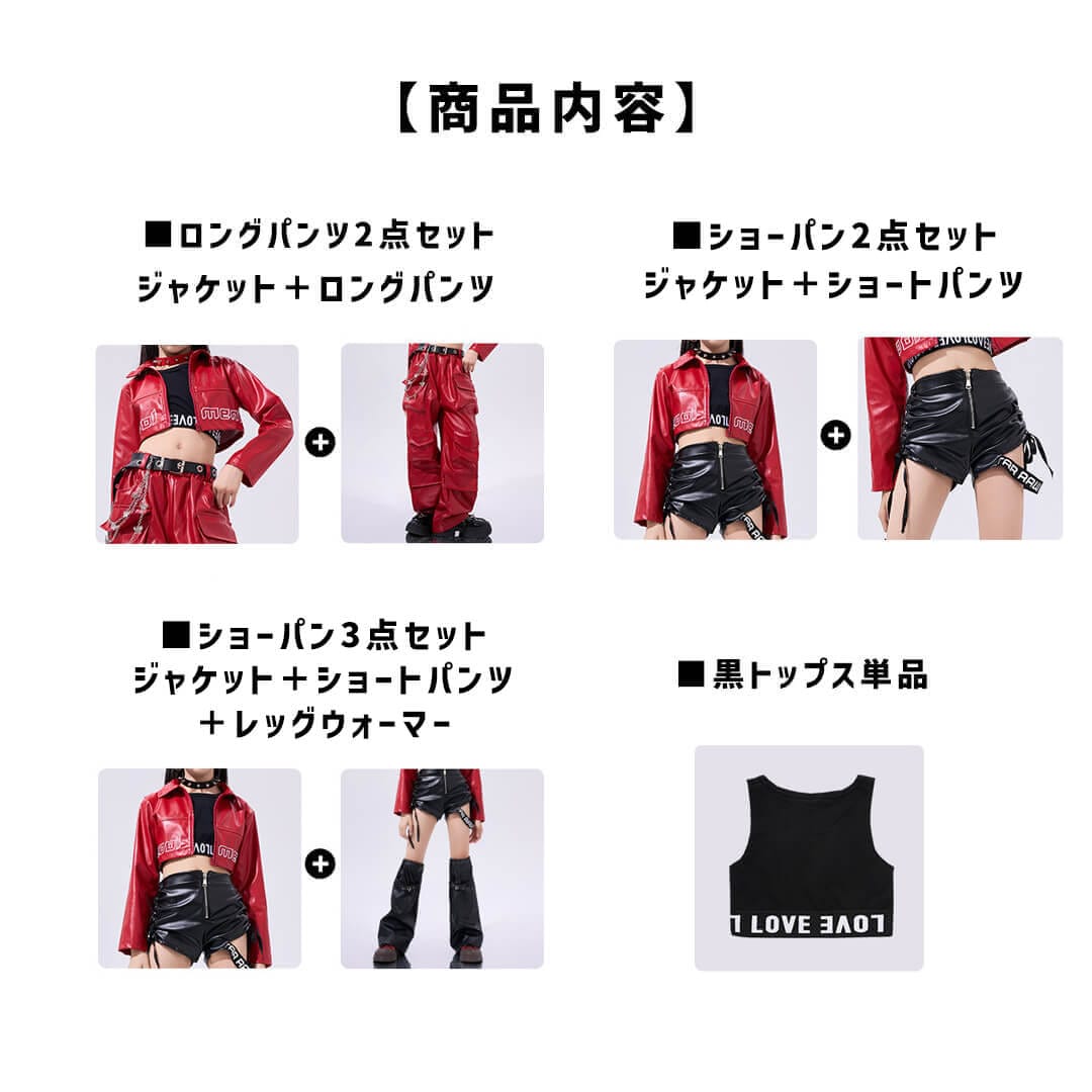 レッドがヘヴィーなフェイクレザー衣装。 2タイプからお選びいただけます。 パンツはウエスト総ゴムです。 セットには黒トップスは付属されておりませんのでご注意ください。 ※洗濯時はネットに入れて洗ってください