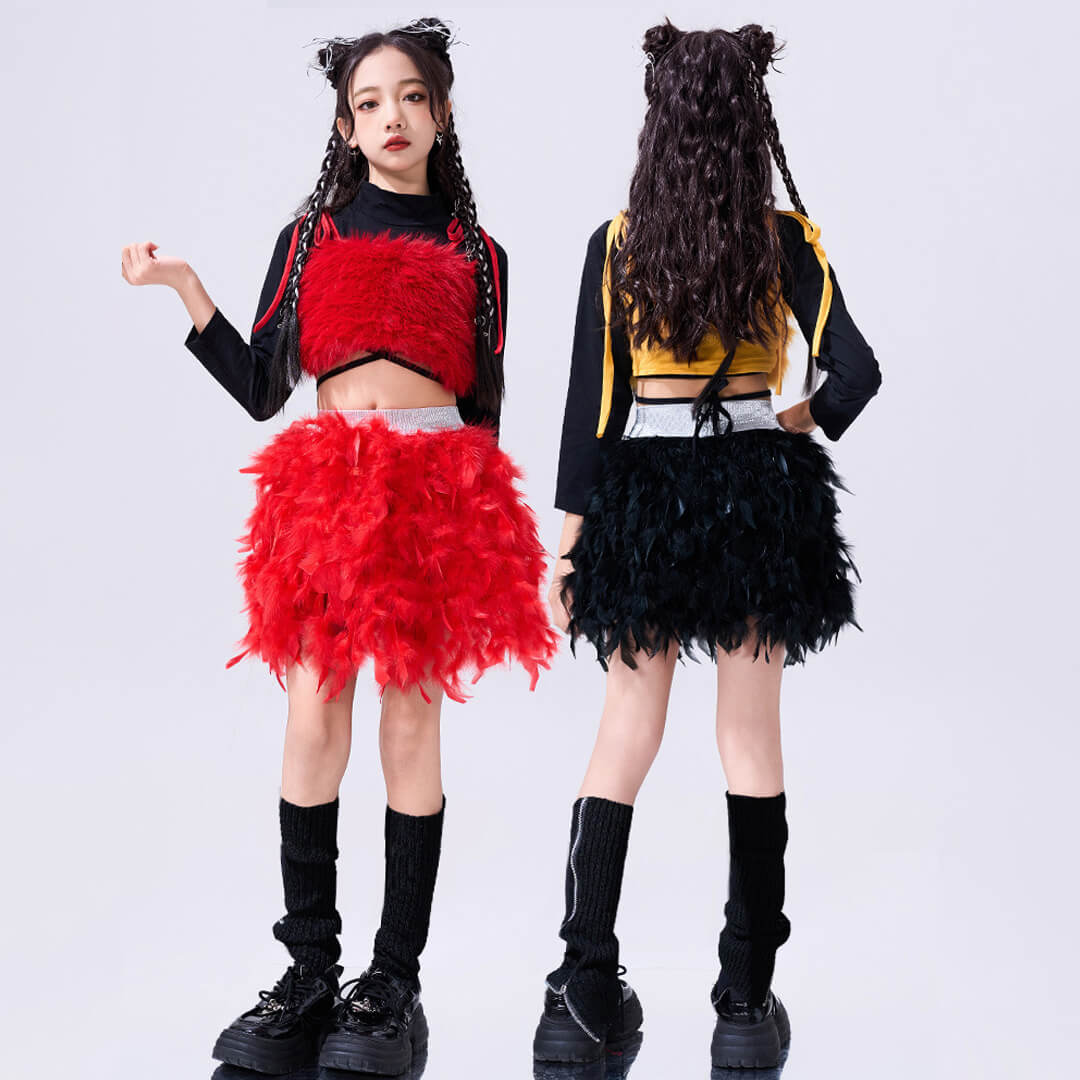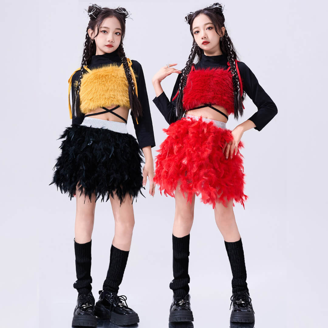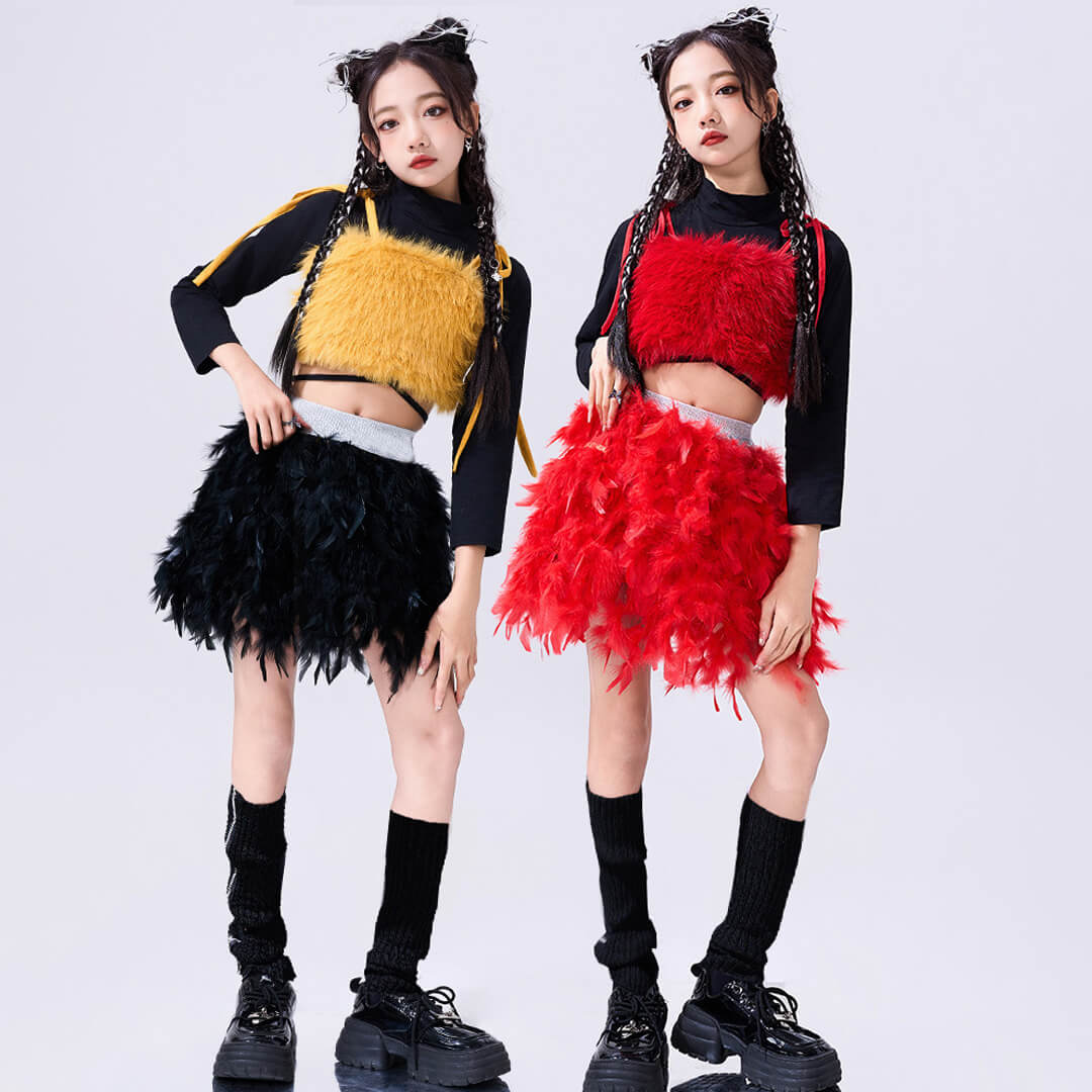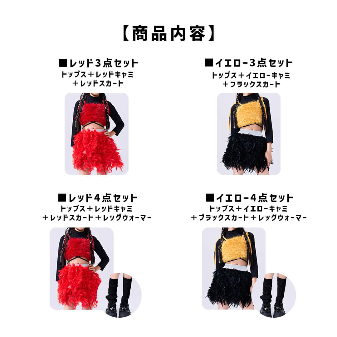 ファー&フェザーで個性的なレッド×イエロー衣装!