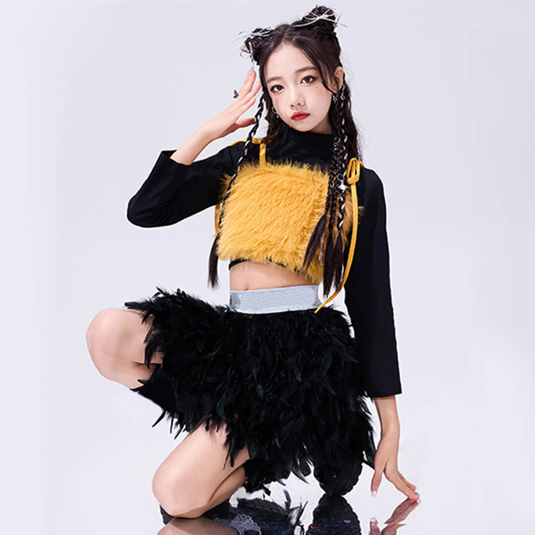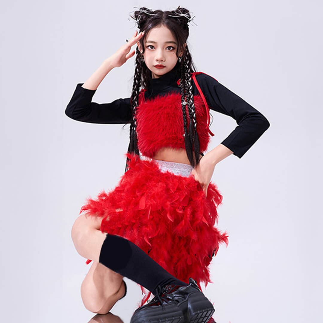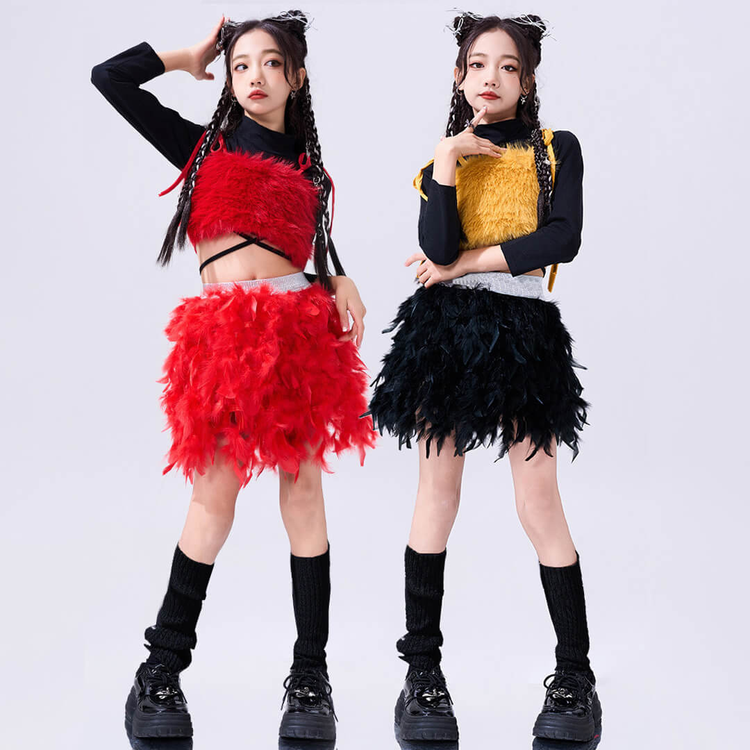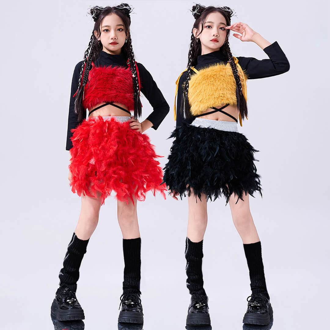 ファー&フェザーで個性的なレッド×イエロー衣装!