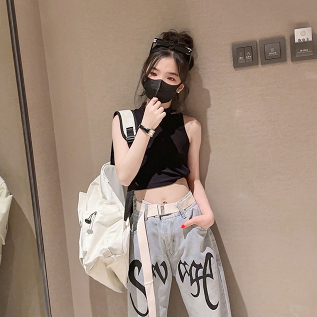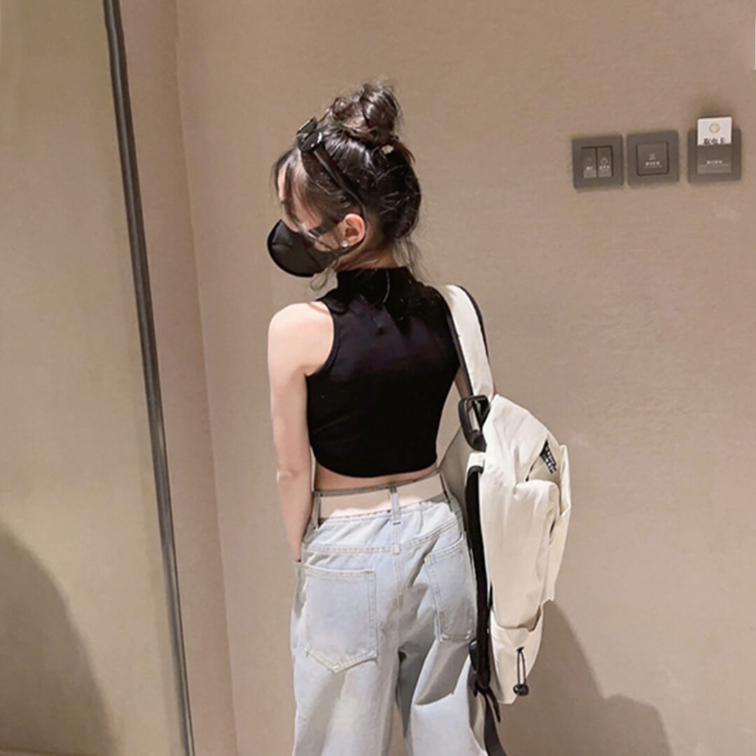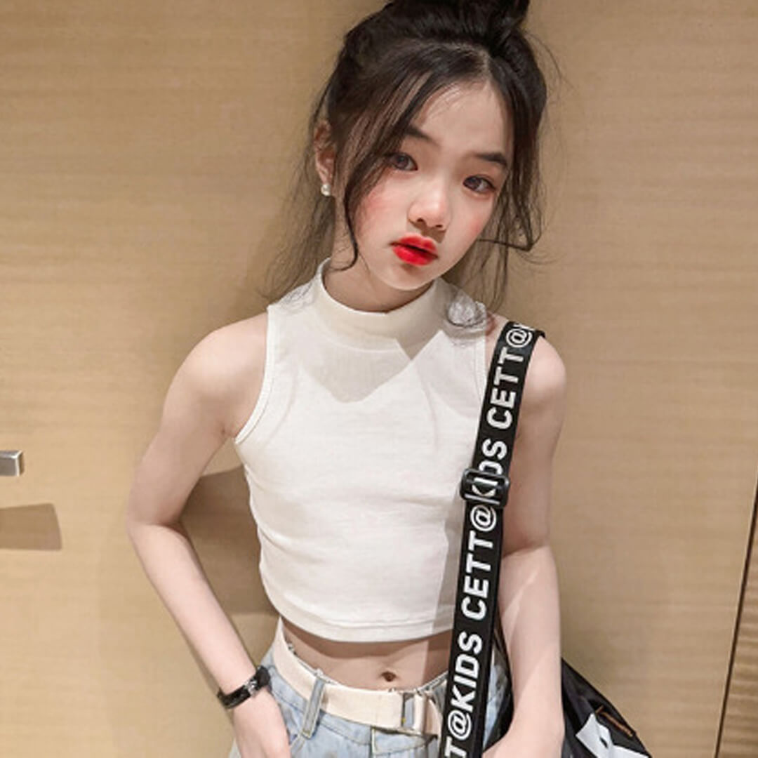 リブニットのクロップド丈タンクトップス。