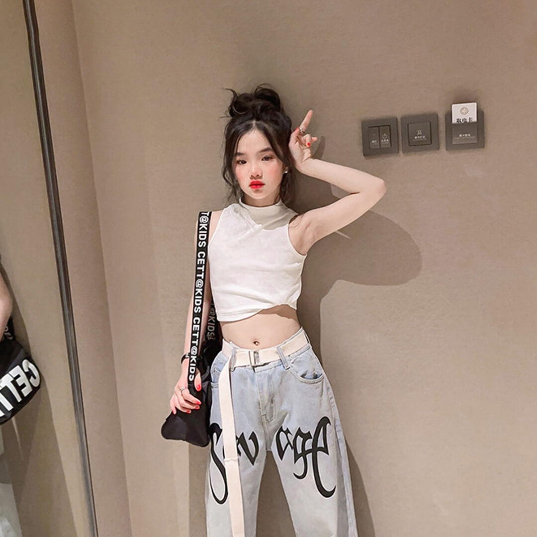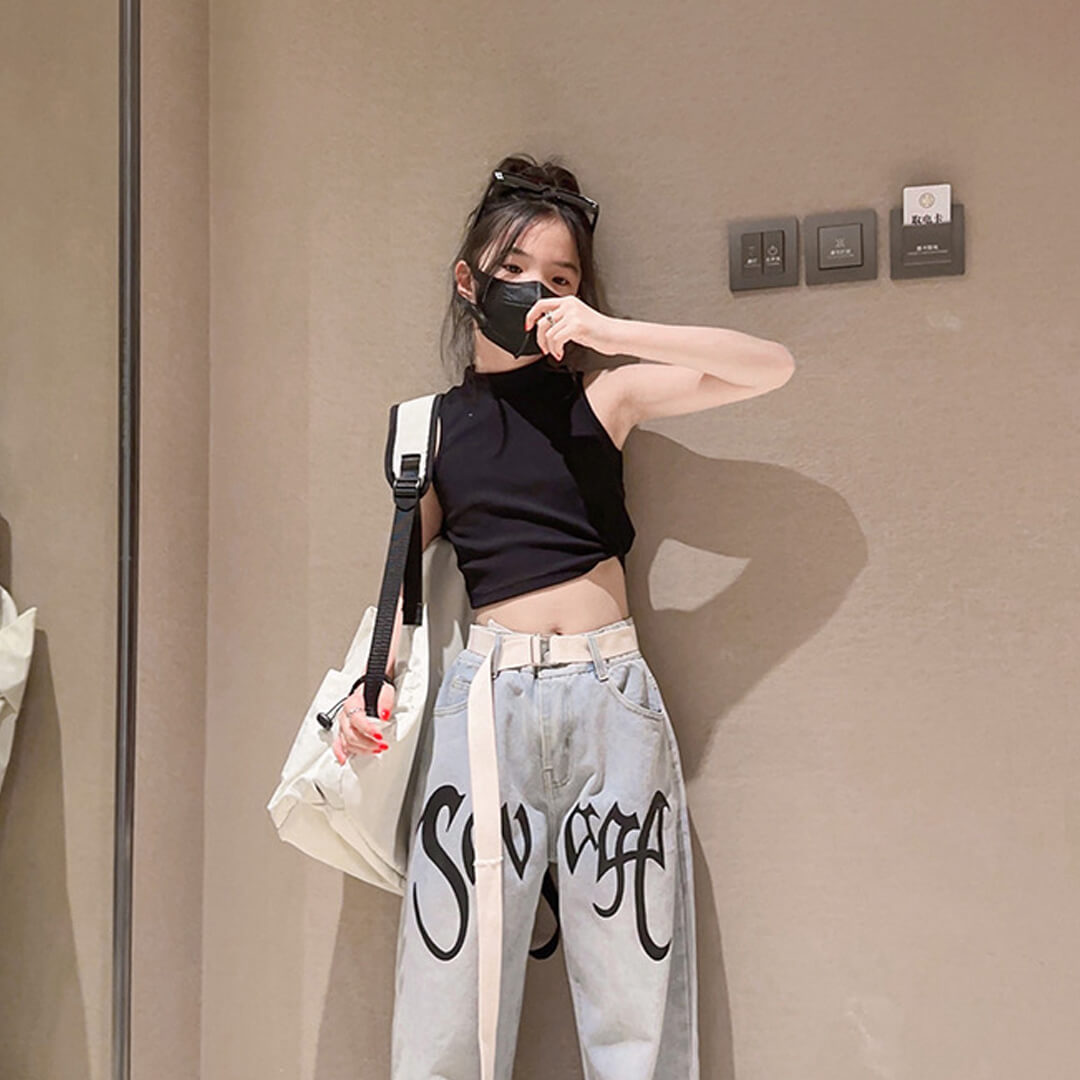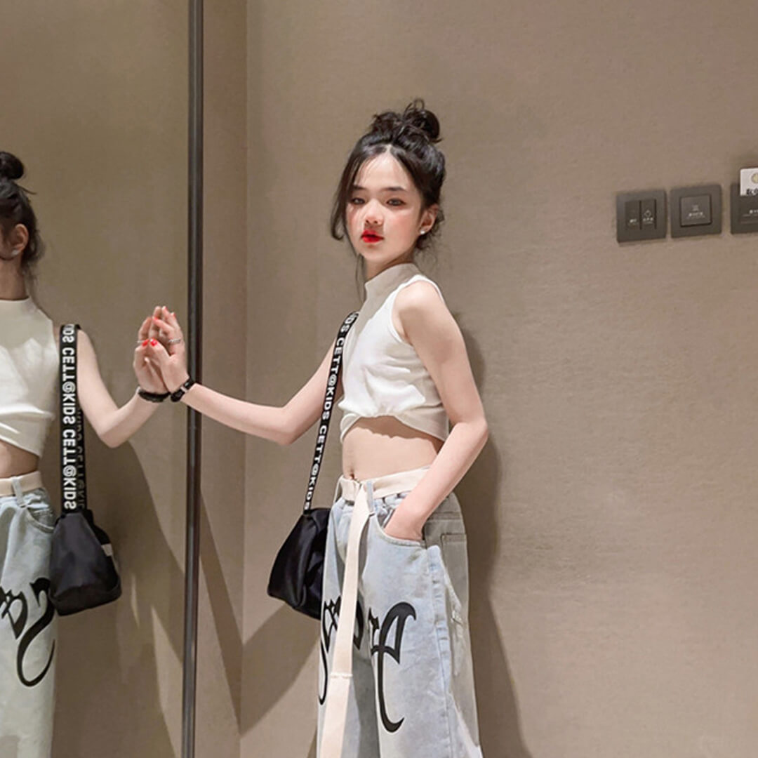リブニットのクロップド丈タンクトップス。