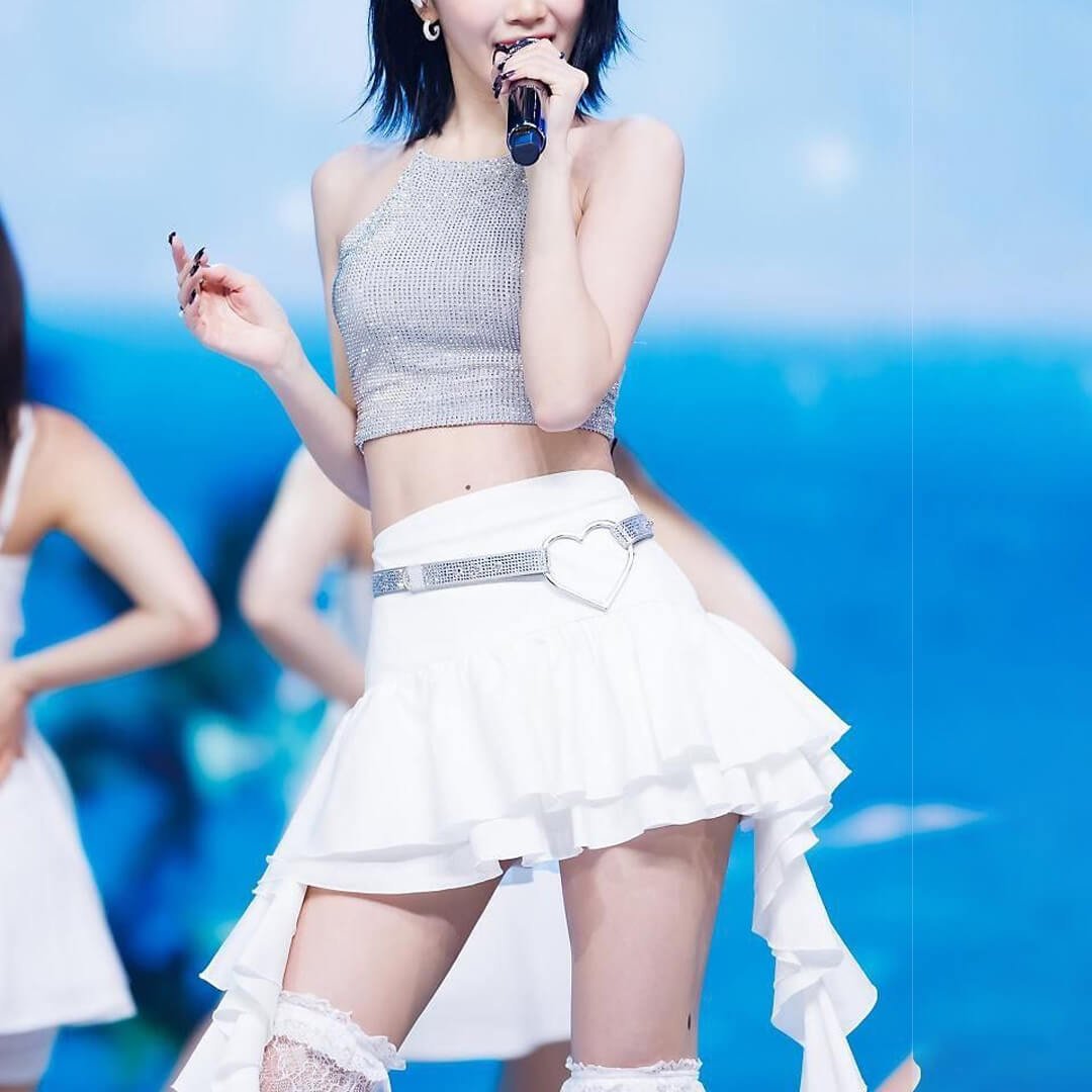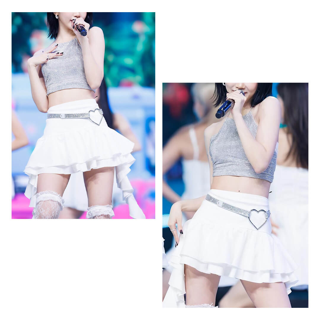 輝くシルバーのトップスと清楚なホワイトフリルスカートが魅力のセットアップです。