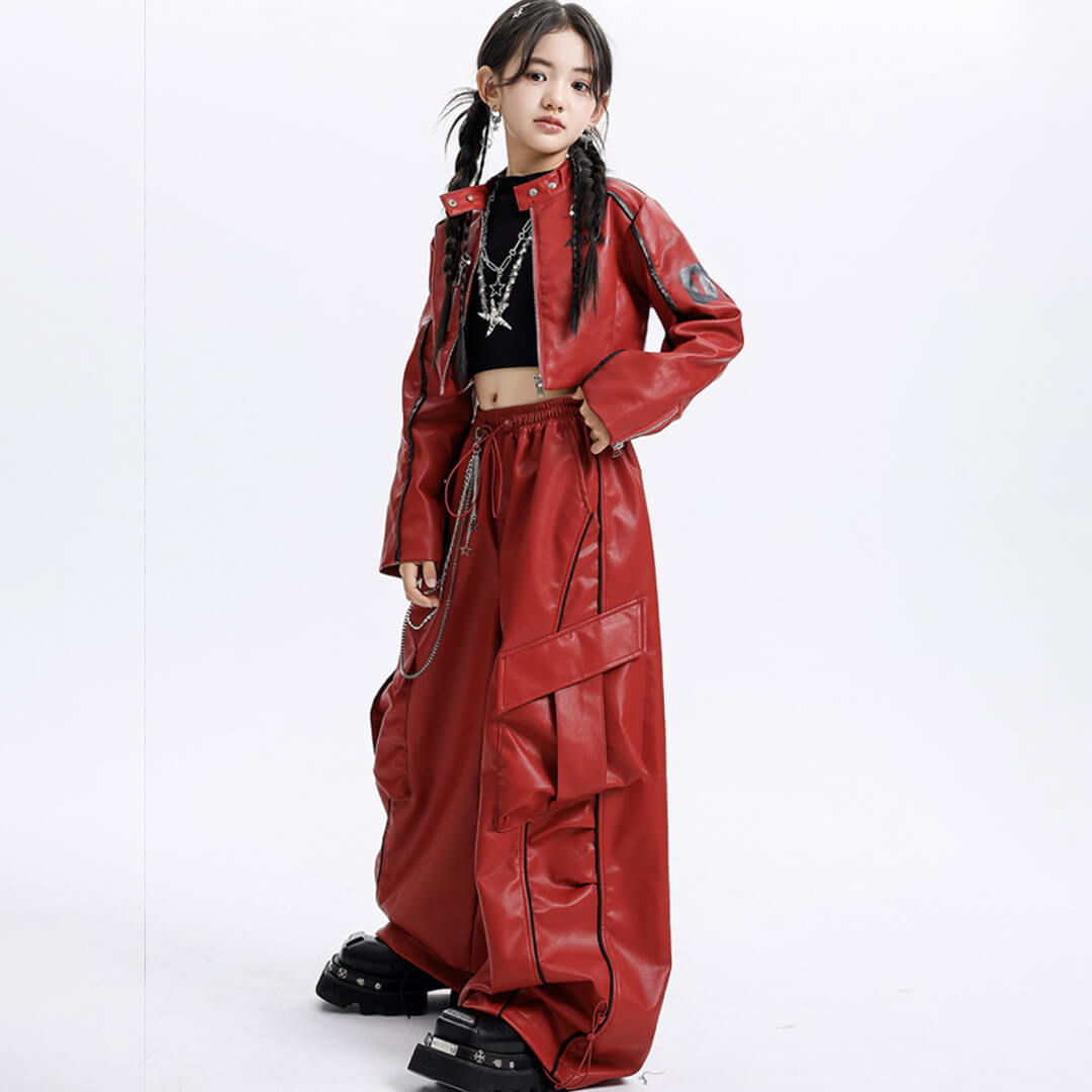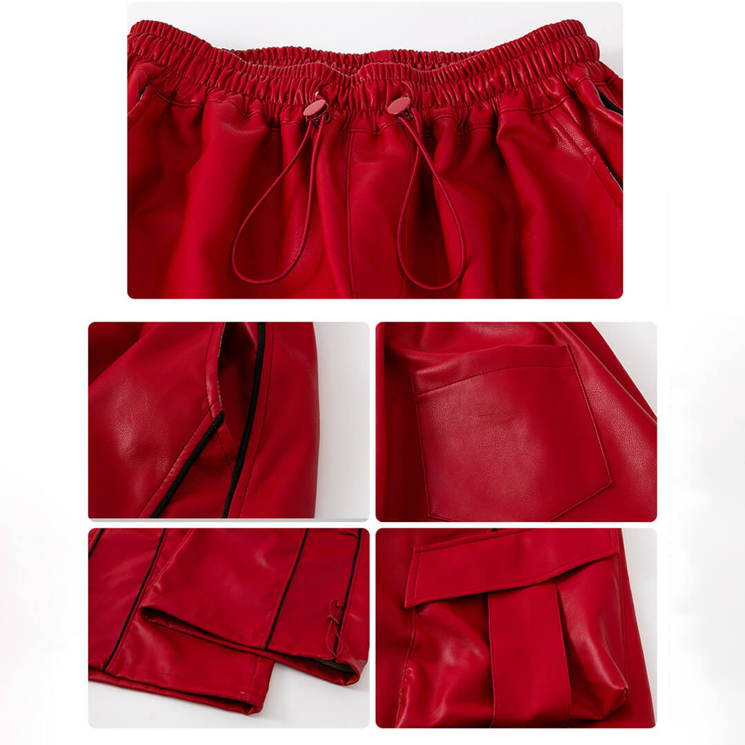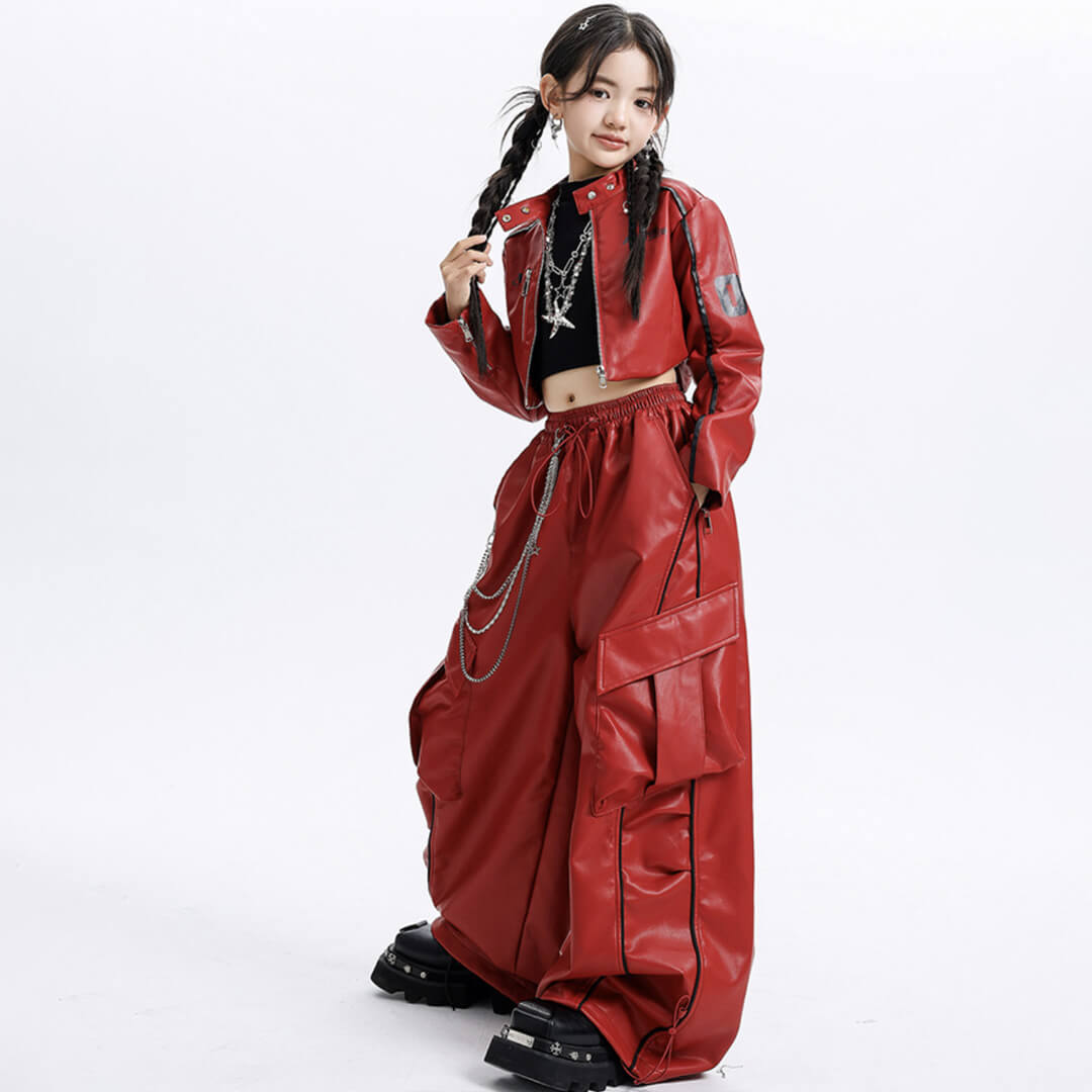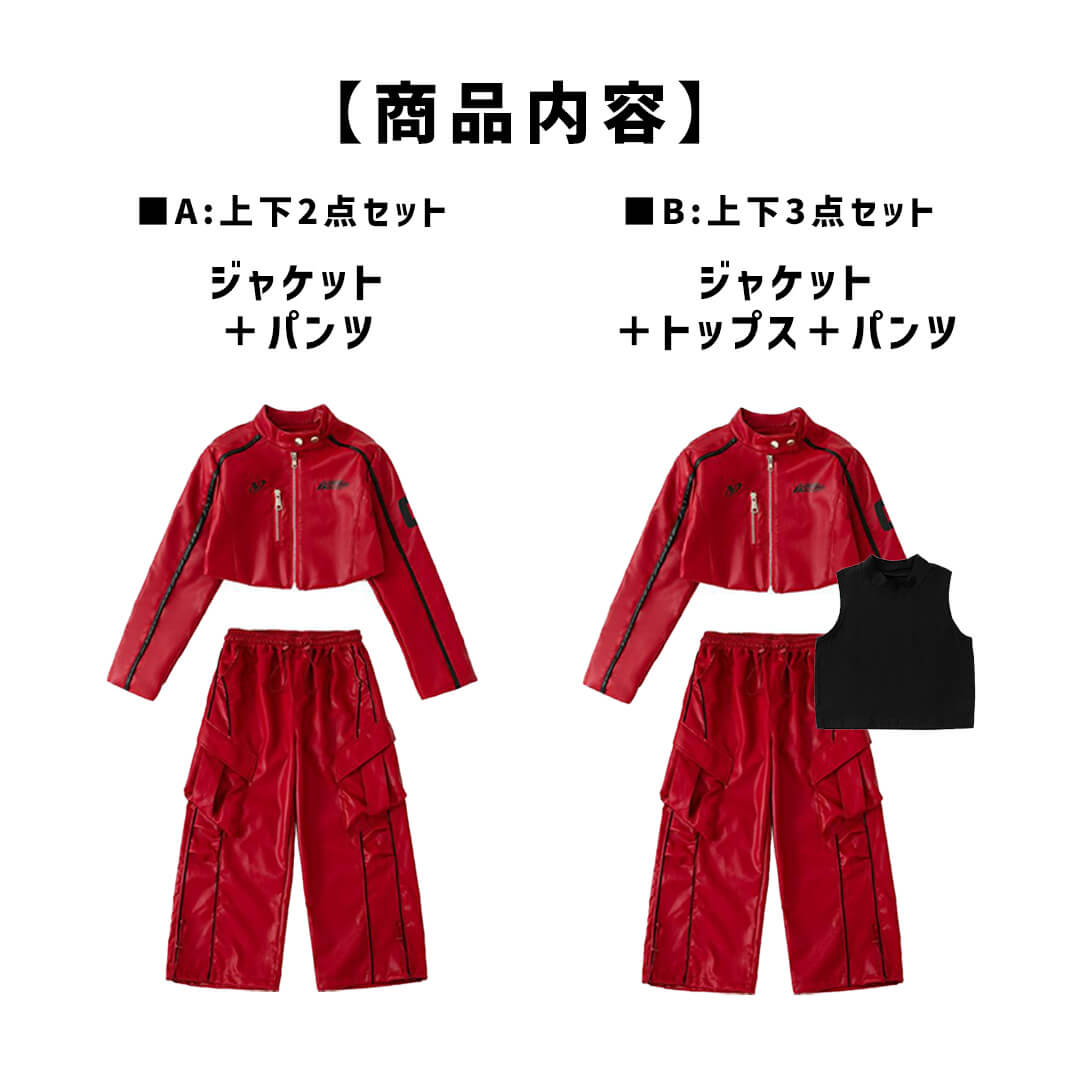 フェイクレザーレッド クロップド丈ジャケット パンツセット【dc-2361】