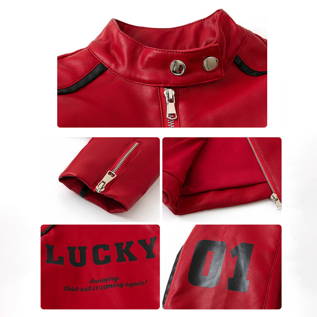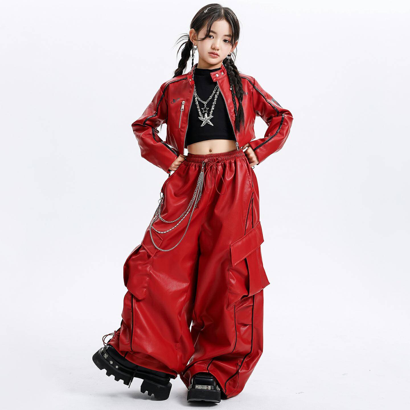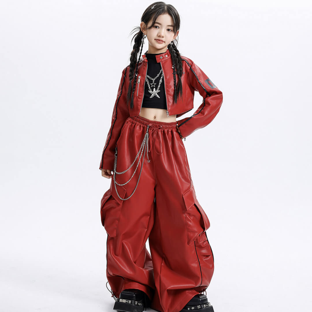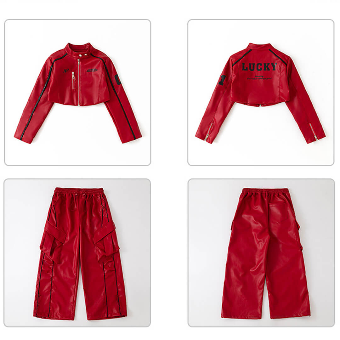 フェイクレザーレッド クロップド丈ジャケット パンツセット【dc-2361】