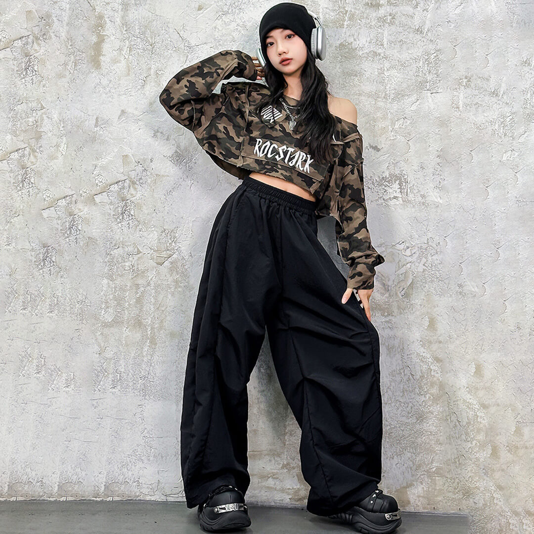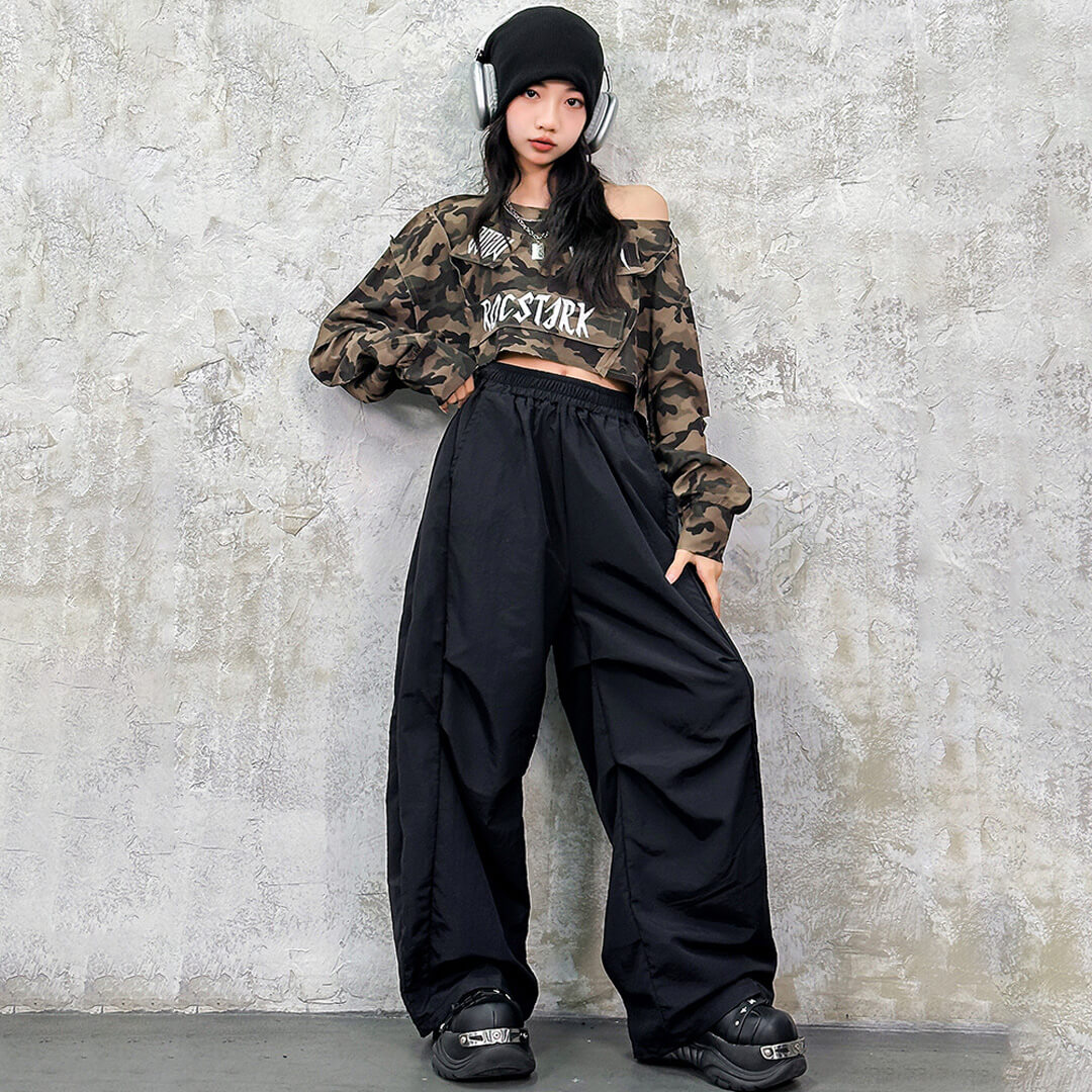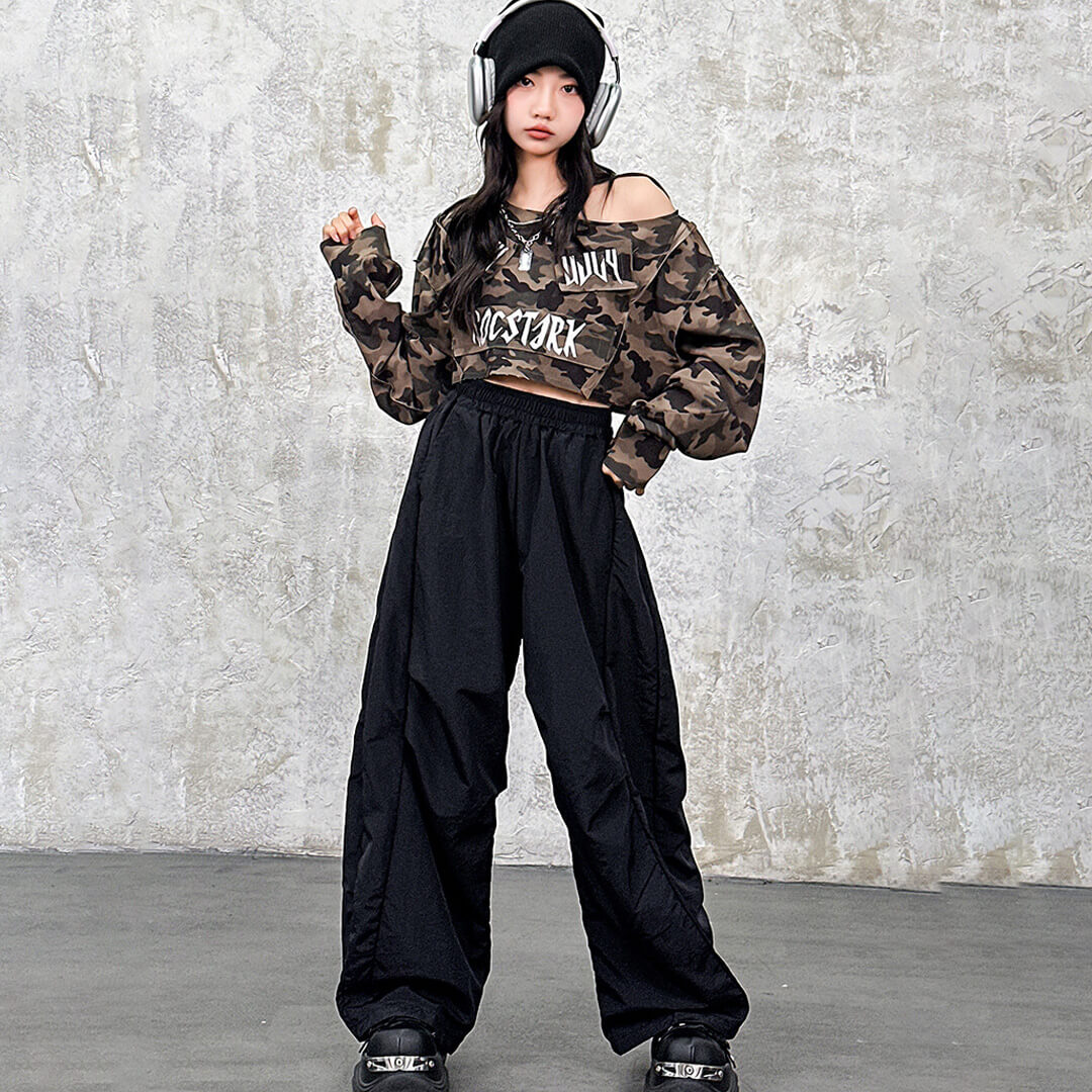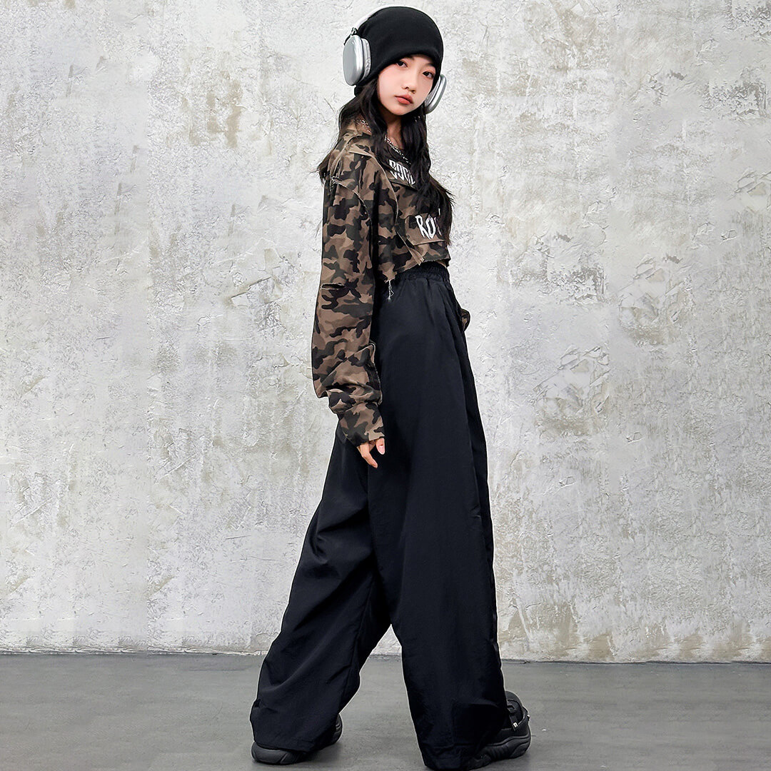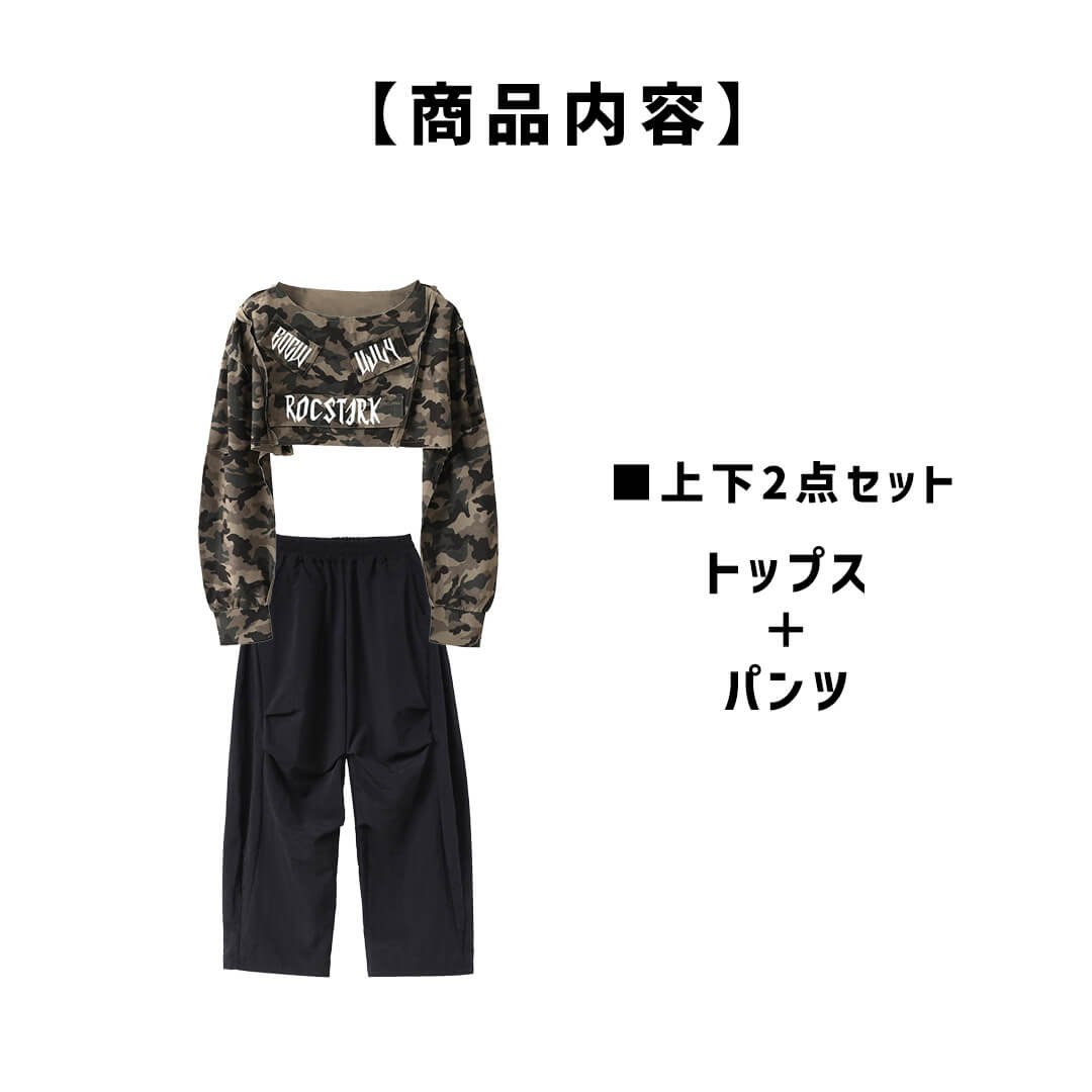 ストリート感たっぷりのカモフラ柄トップスが目立つガールズ衣装!