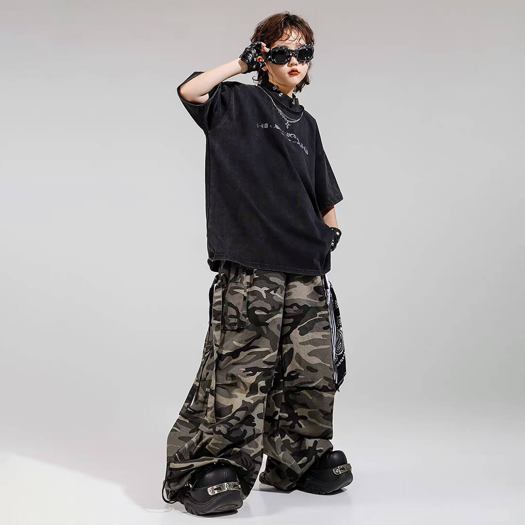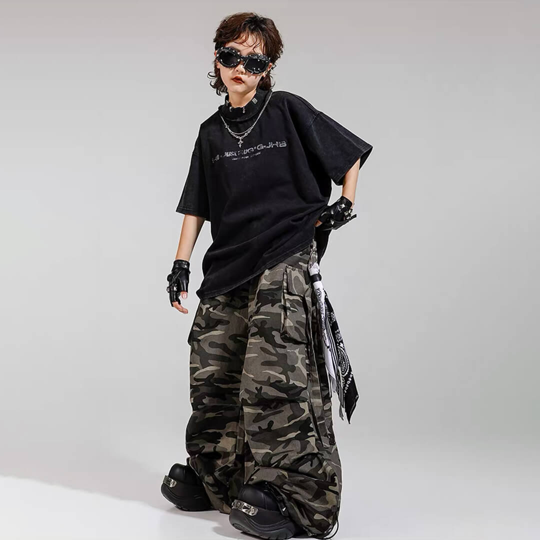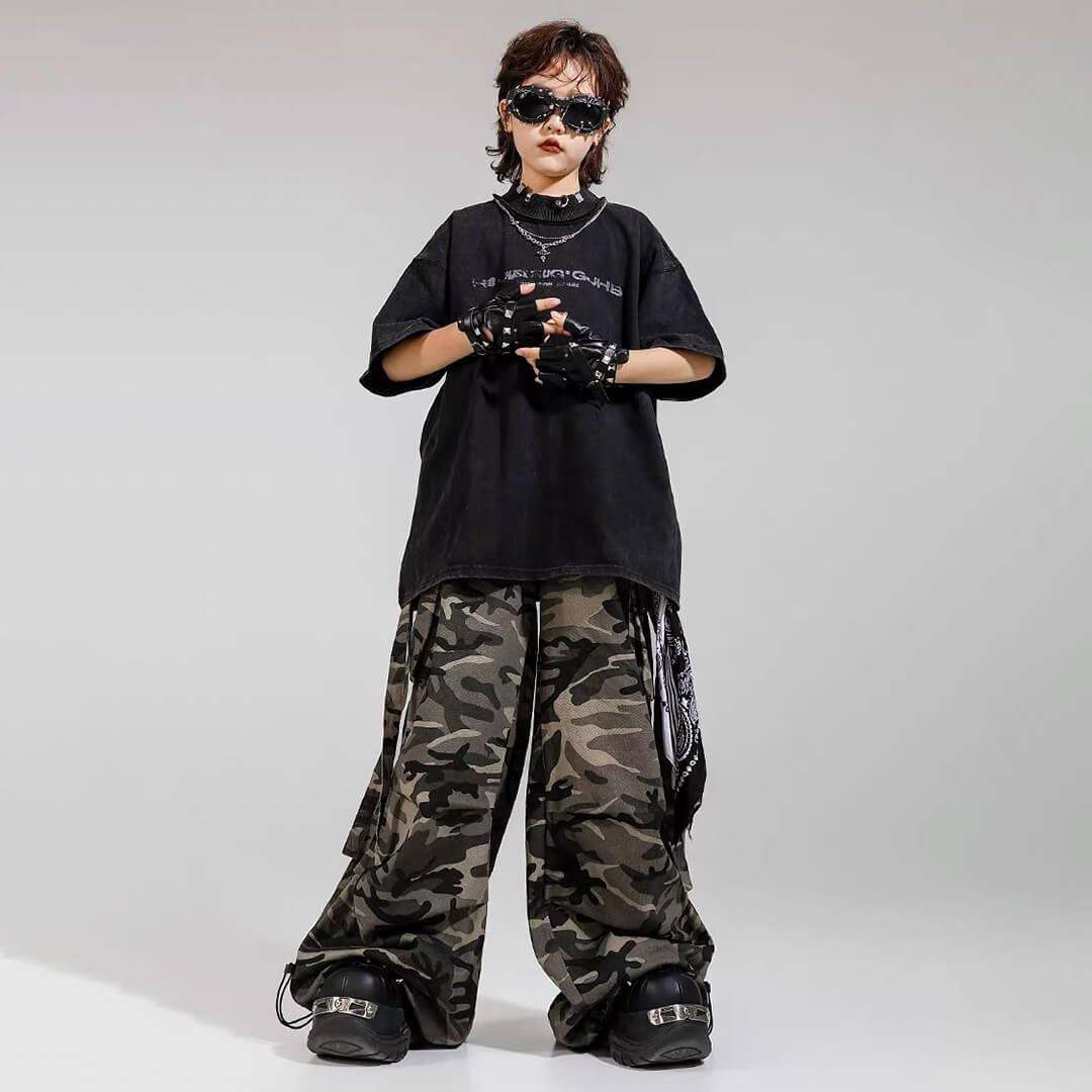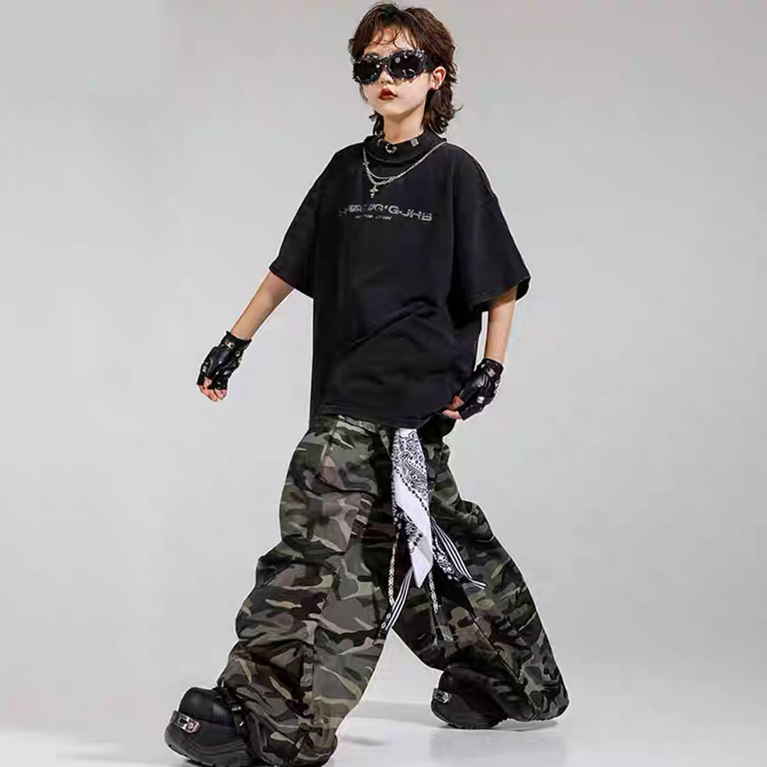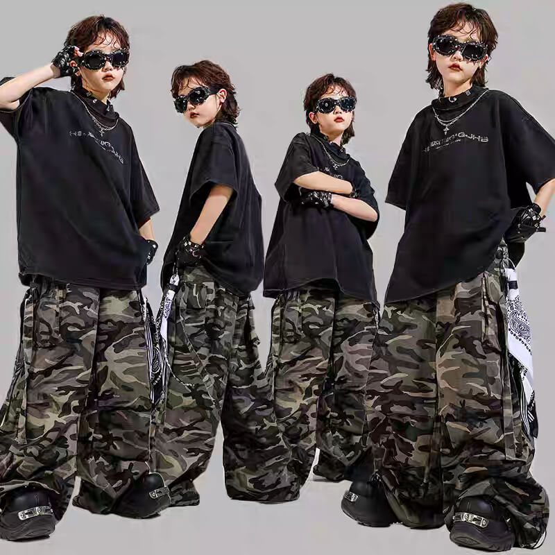子供たちのダンスパフォーマンスを一層引き立てる、ストリートブラックTシャツ迷彩パンツセットアップ【dc-2474】