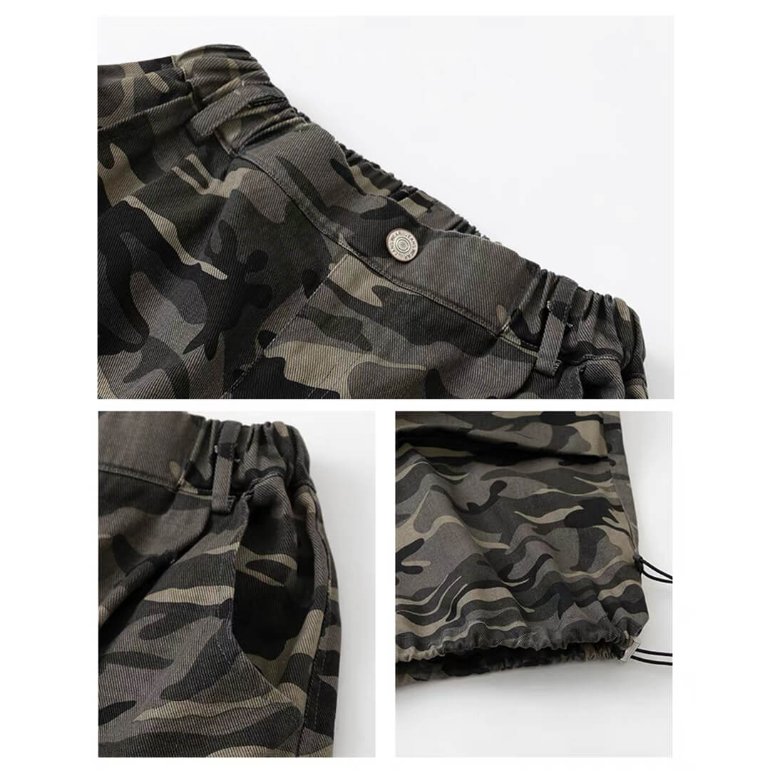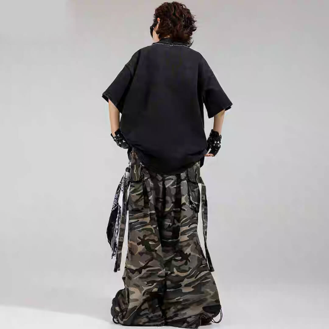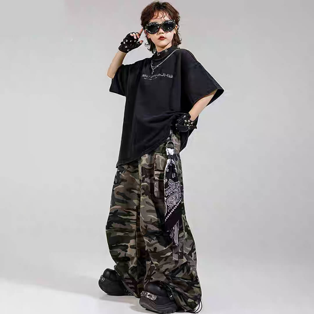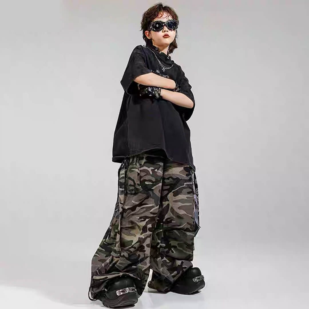 子供たちのダンスパフォーマンスを一層引き立てる、ストリートブラックTシャツ迷彩パンツセットアップ【dc-2474】