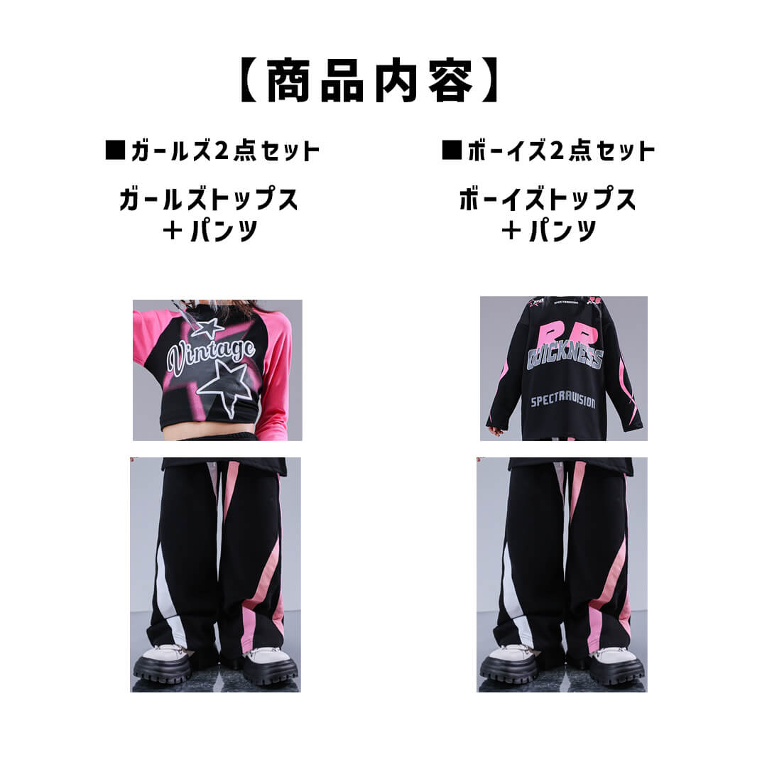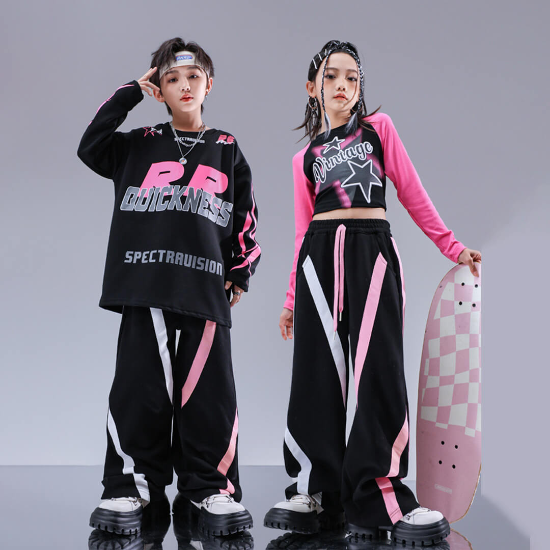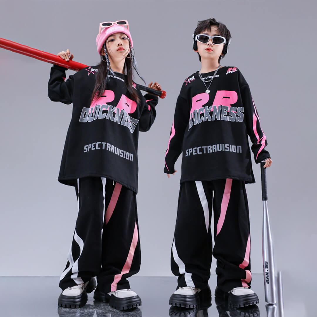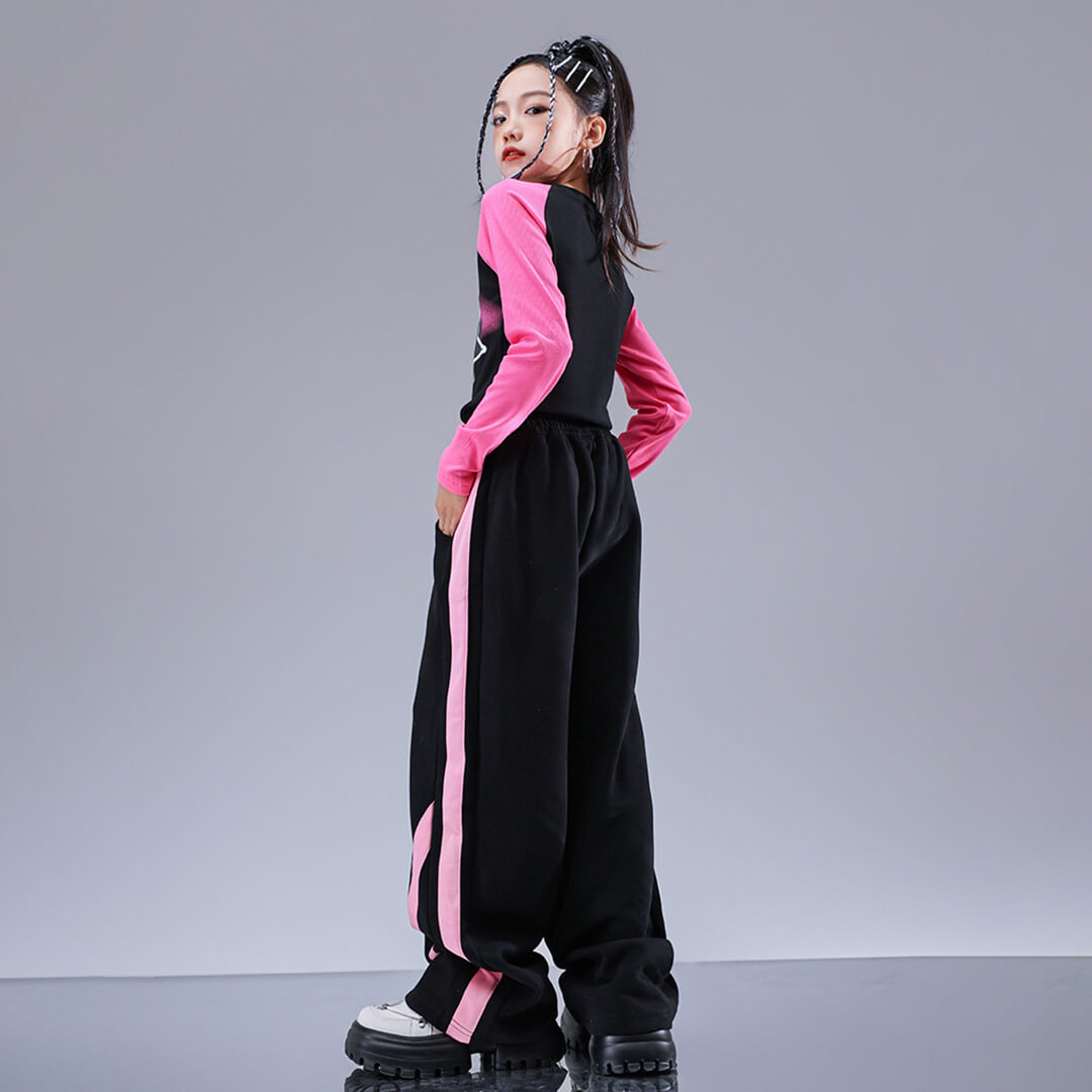 ブラック×ピンクユニセックスパンツセット【dc-2478】で、キッズたちのダンスをさらに楽しく彩りましょう!