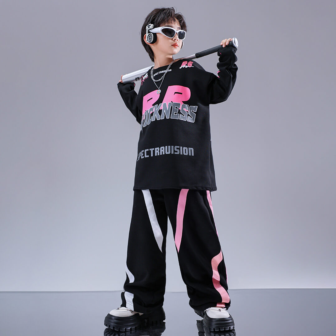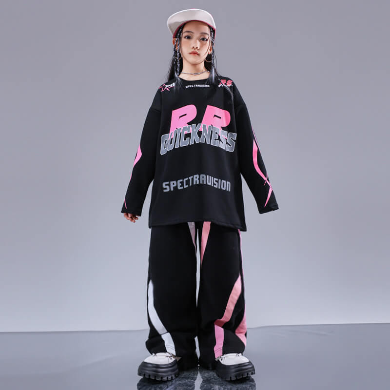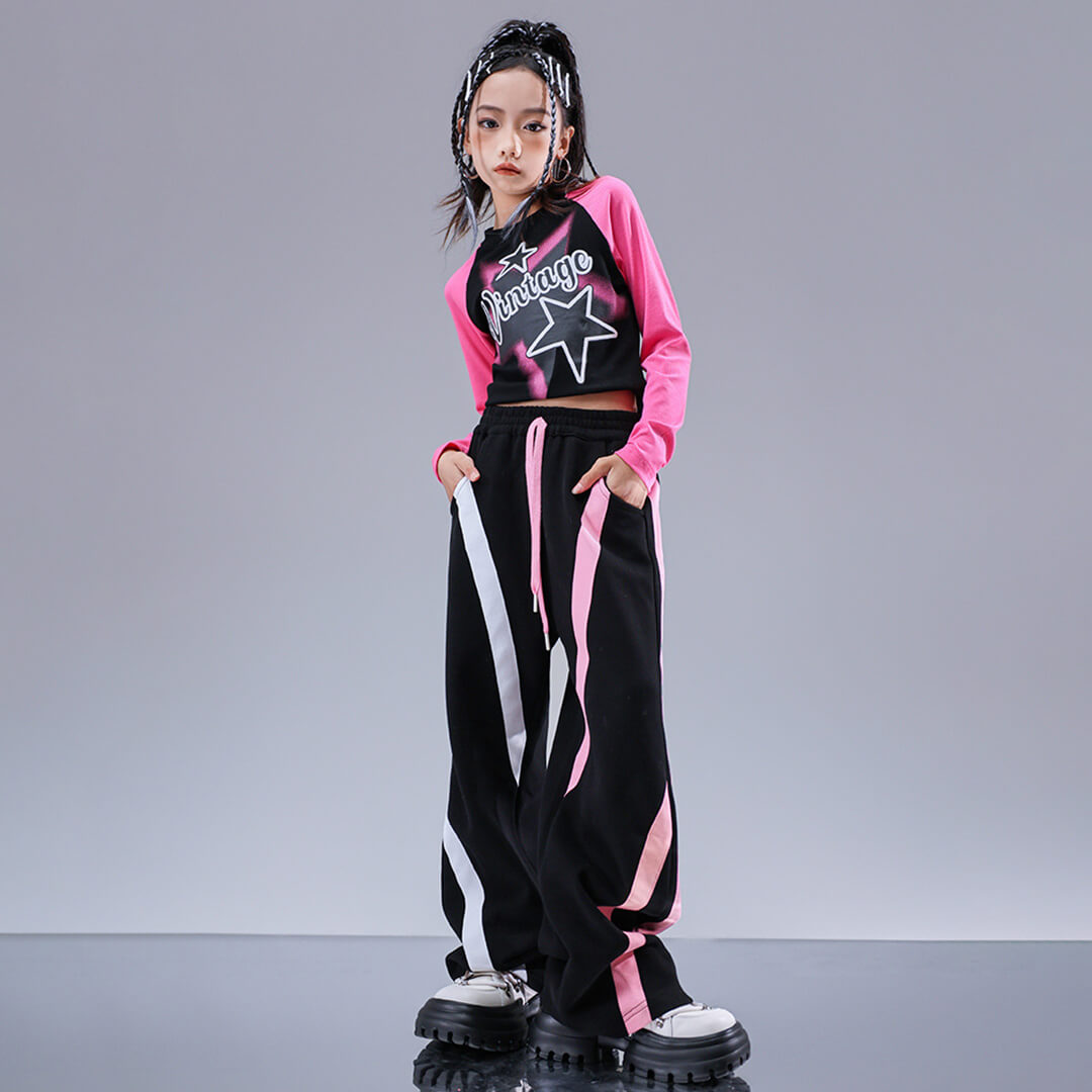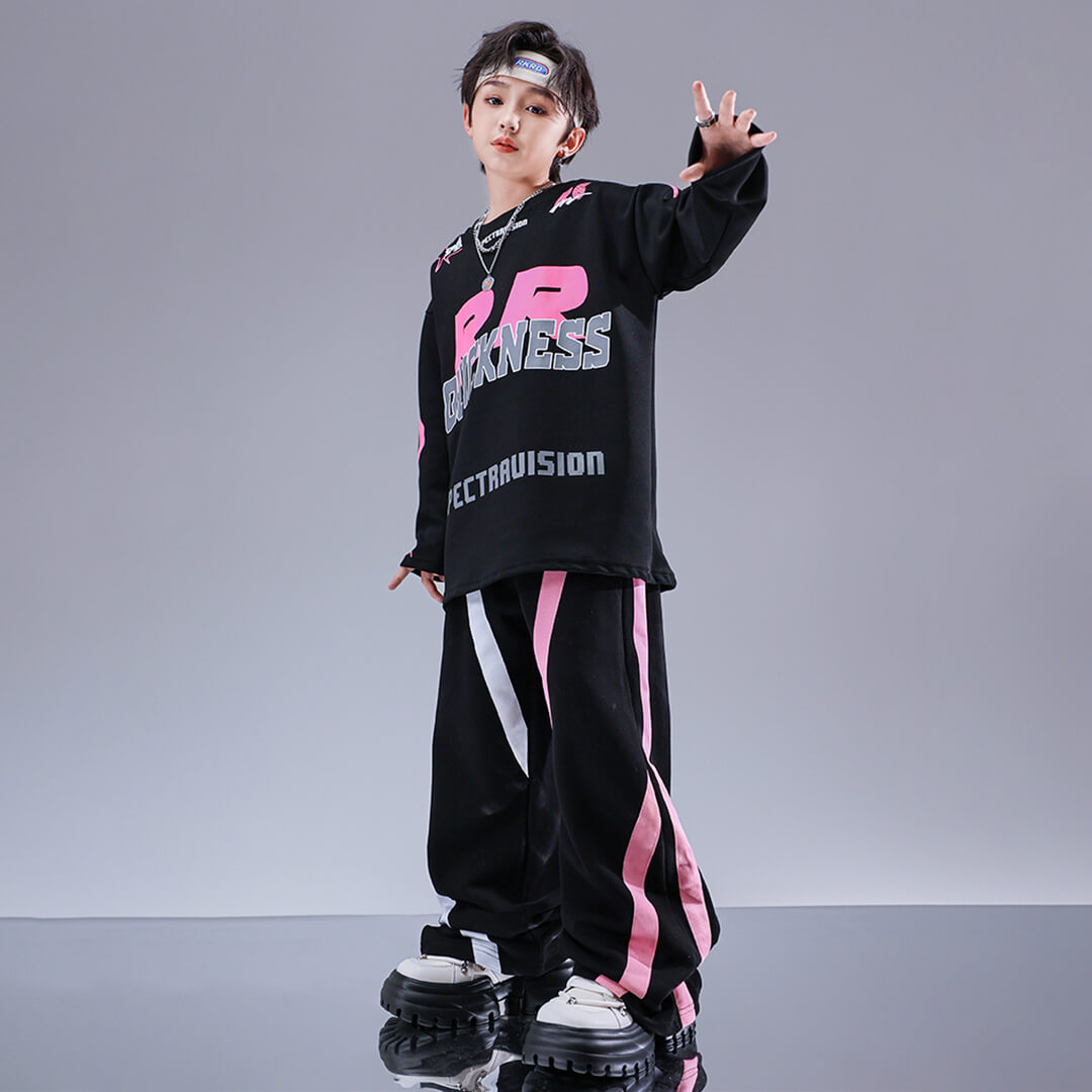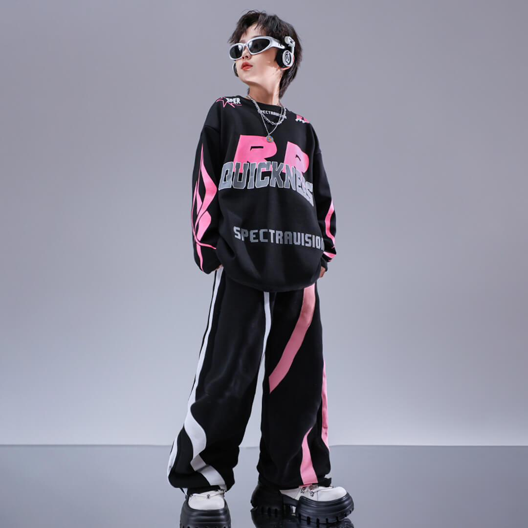 ブラック×ピンクユニセックスパンツセット【dc-2478】で、キッズたちのダンスをさらに楽しく彩りましょう!