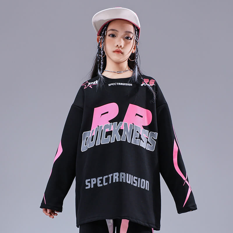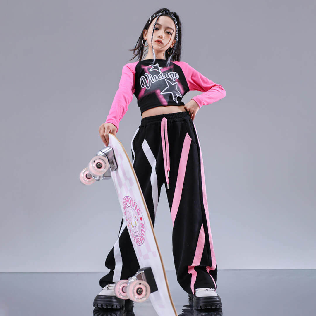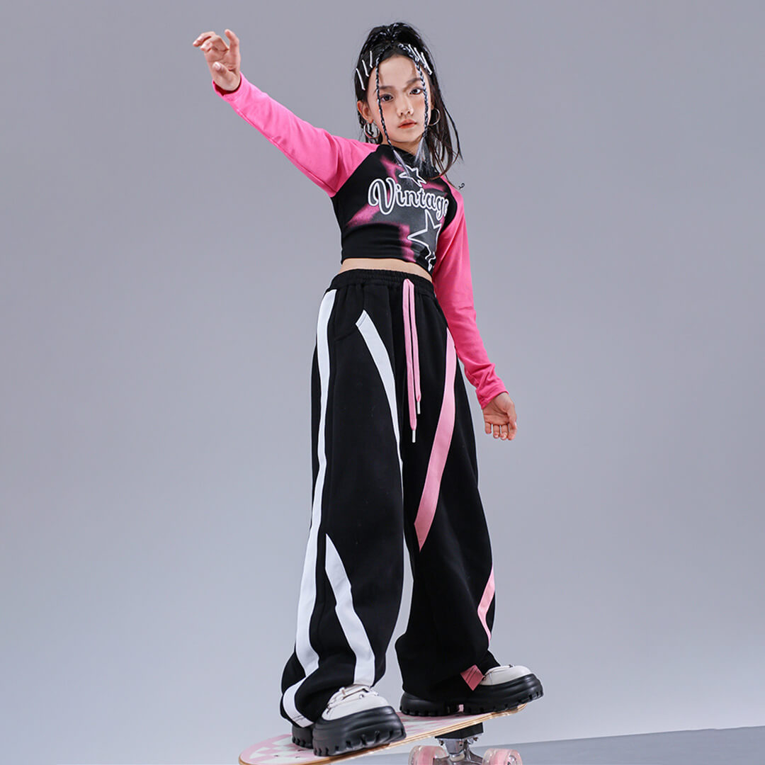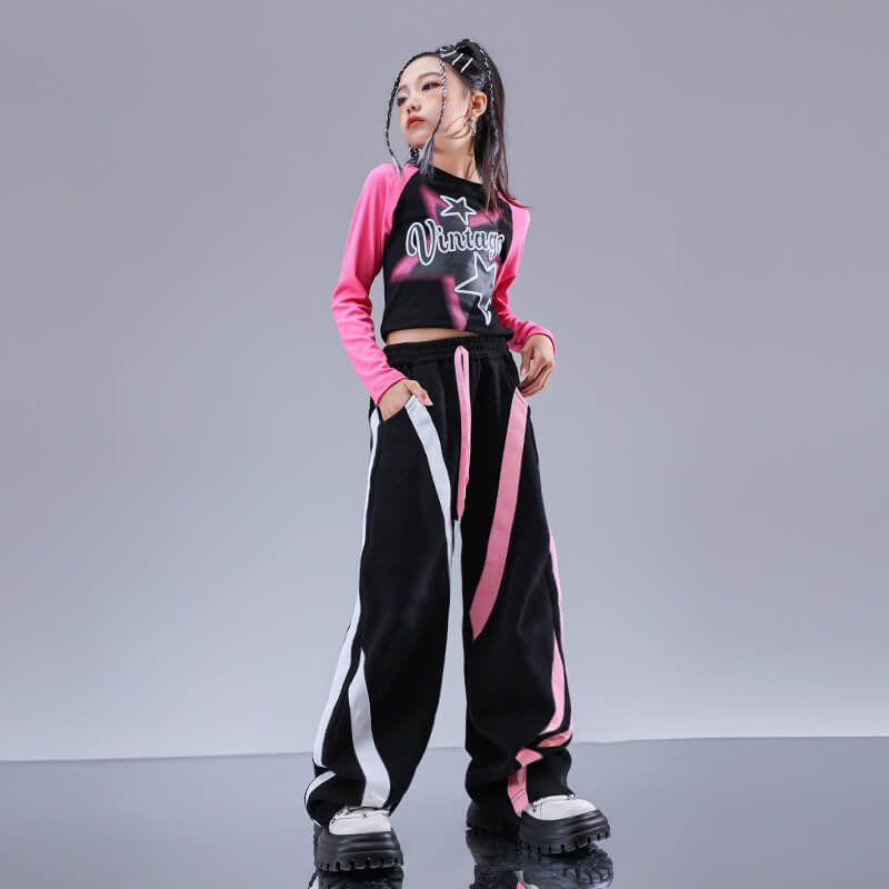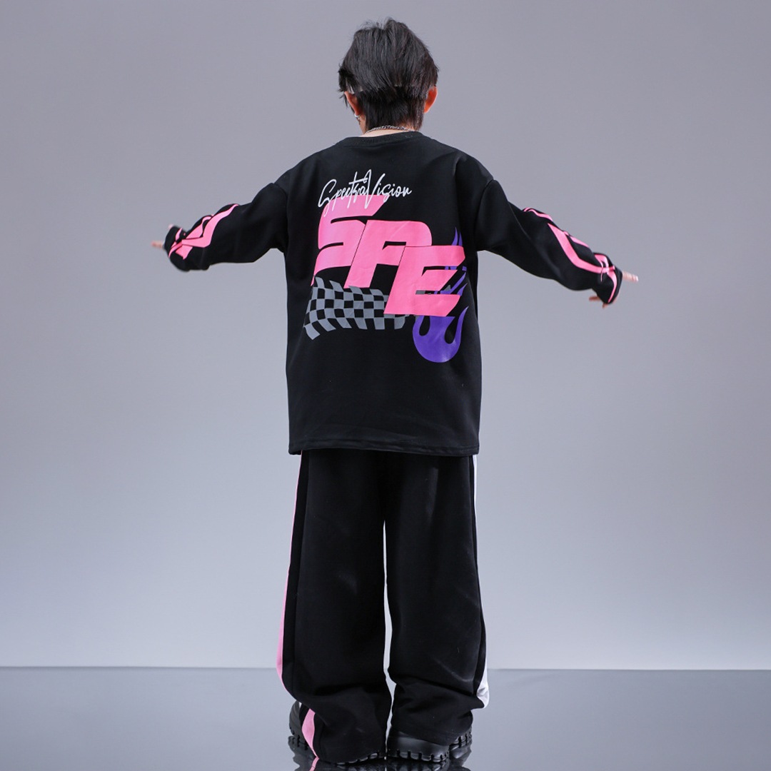 ブラック×ピンクユニセックスパンツセット【dc-2478】で、キッズたちのダンスをさらに楽しく彩りましょう!