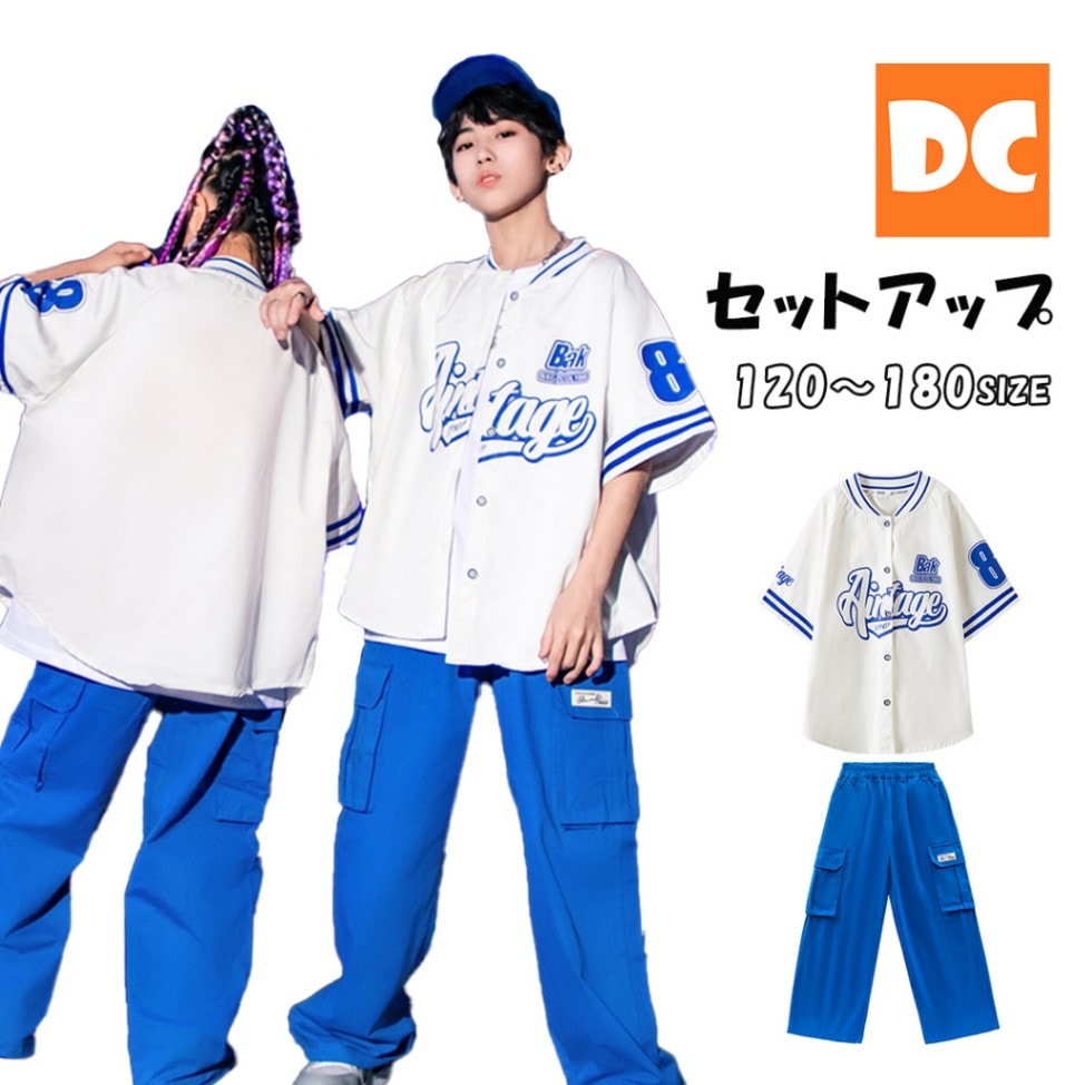 ユニセックス衣装 HIPHOP衣装 キッズ衣装 ブルー ダボダボ ストリート ユニフォーム ホワイト ロングパンツ セットアップ120~180【dc-1148】