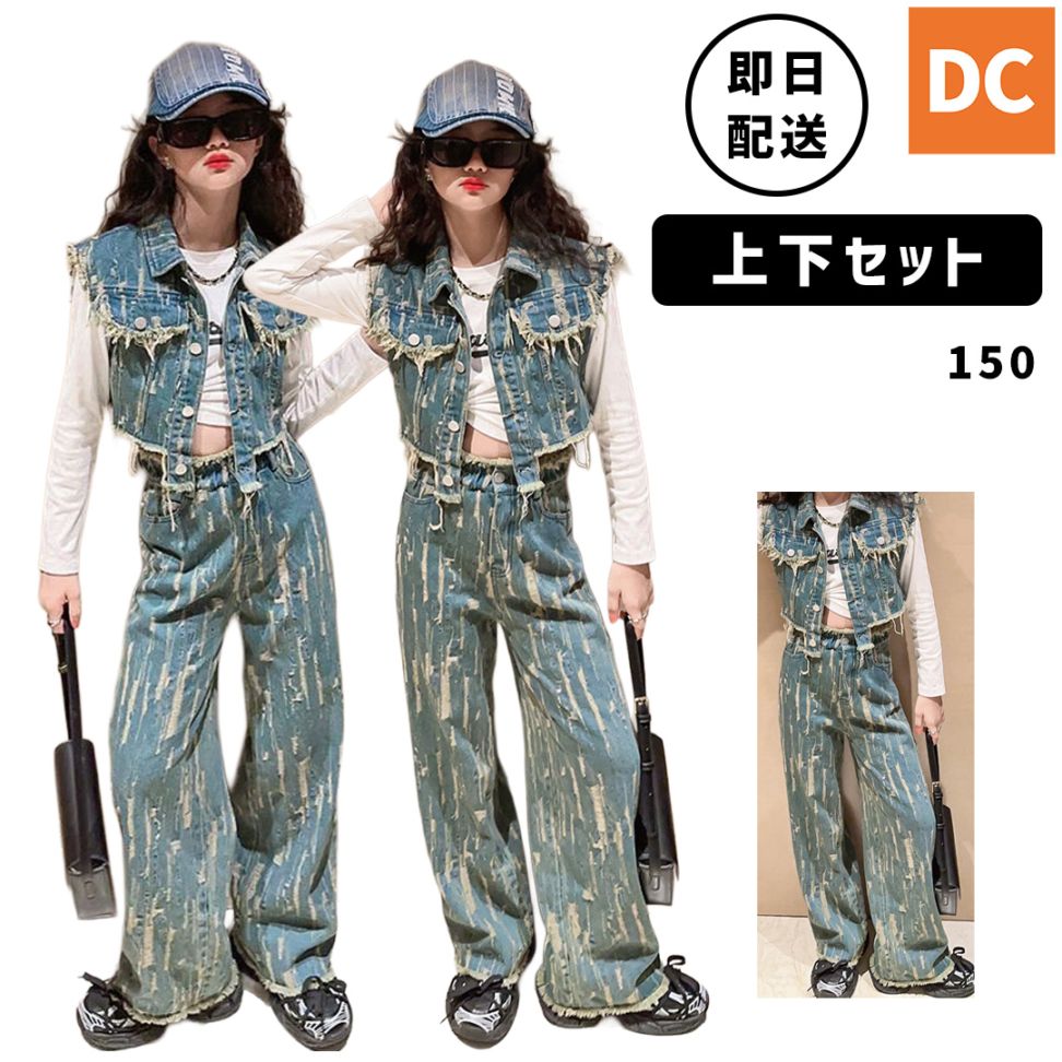 HIPHOP衣装 キッズ衣装 ガールズ K-POP デニム 秋冬 ベスト 長袖 ブルー ブラック ペイント柄 ロングパンツ 110~170【dc-1282】