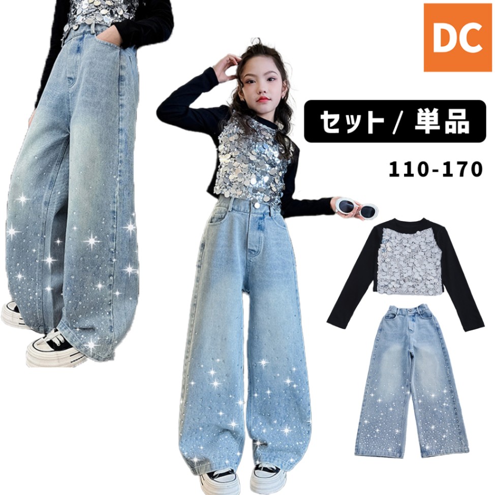 ガールズ衣装 HIPHOP衣装 キッズ衣装 K-POP ブラック ブルー デニム パール スパンコール 長袖 ロングパンツ ショートトップス 110~170【dc-1531】