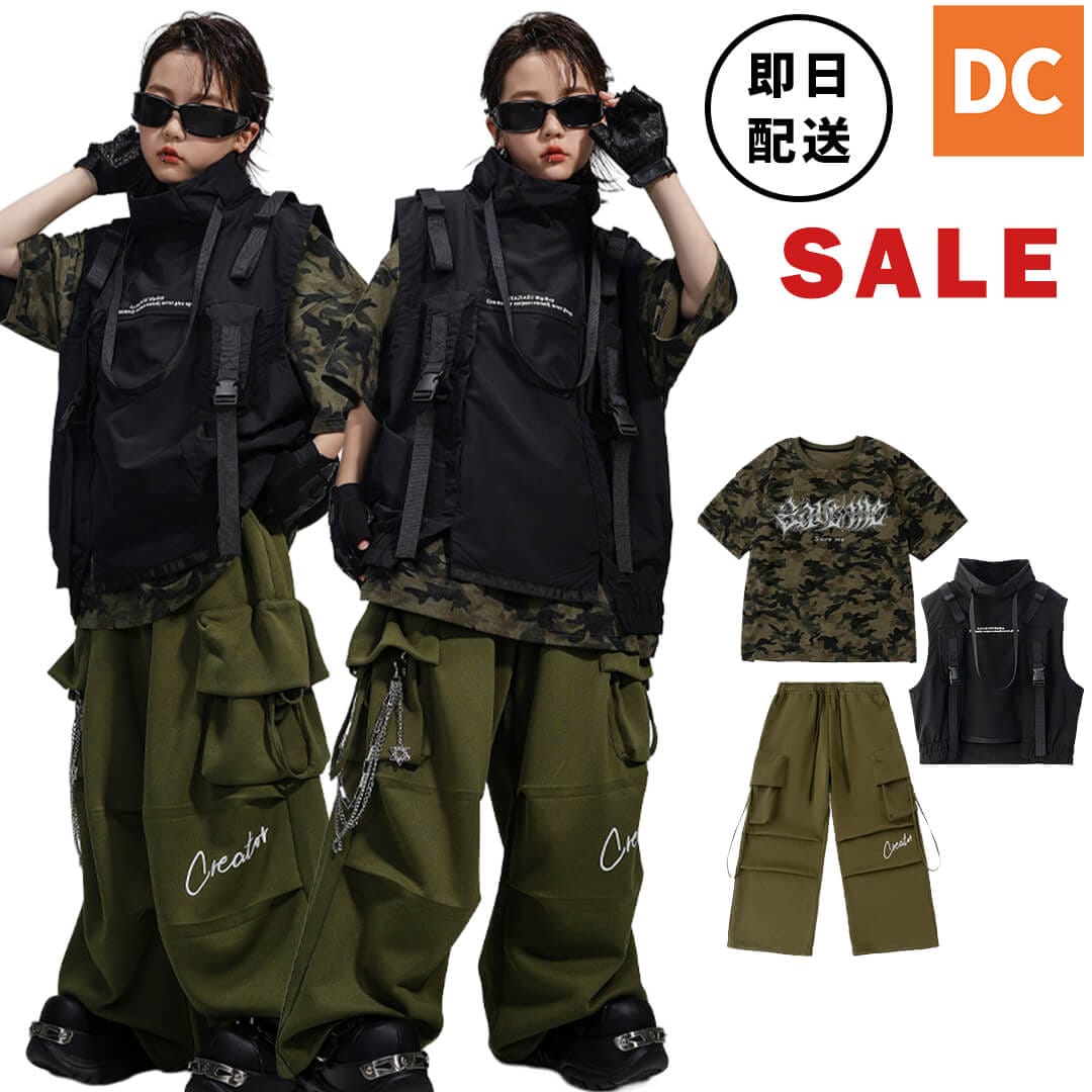 ガールズ衣装 HIPHOP 迷彩 ブラック カーキ ノースリーブ ロングパンツ アームカバー 蝶 カーゴパンツ タンクトップ【dc-2059】